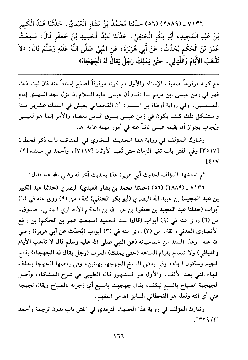 ٧١٣٦ - (٢٨٨٩) (٥٦) (حدثنا محمد بن بشار العبدي) البصري (حدثنا عبد الكبير بن عبد المجيد) بن عبيد الله البصري (أبو بكر الحنفي) ثقة، من (٩) روى عنه في (٦) أبواب (حدثنا عبد المجيد بن جعفر) بن عبد الله بن الحكم الأنصاري المدني، صدوق، من (٦) روى عنه في (٩) أبواب (قال) عبد الحميد (سمعت عمر بن الحكم) بن رافع الأنصاري المدني، ثقة، من (٣) روى عنه في (٣) أبواب (يُحدّث عن أبي هريرة) رضي الله عنه. وهذا السند من خماسياته (عن النبي صلى الله عليه وسلم قال لا تذهب الأيام والليالي) ولا تنعدم بقيام الساعة (حتى يملك) العرب (رجل يقال له الجهجاه) بفتح الجيم وسكون الهاء، وفي بعض النسخ الجهجها بهائين، وفي بعضها الجهجا بحذف الهاء التي بعد الألف، والأول هو المشهور قاله الطيبي في شرح المشكاة، وأصل الجهجهة الصياح بالسبع ليكف، يقال جهجهت بالسبع أي زجرته بالصياح ويقال تجهجه عني أي انته ولعله هو القحطاني السابق اهـ من المفهم.