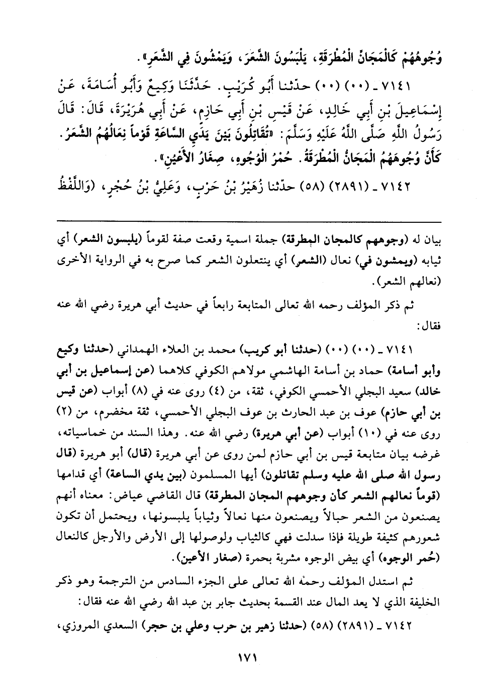 ٧١٤١ - (٠٠) (٠٠) حدثنا أَبُو كُرَيبٍ. حَدَّثَنَا وَكِيعٌ وَأَبُو أُسَامَةَ، عَنْ إِسْمَاعِيلَ بْنِ أَبِي خَالِدٍ، عَنْ قَيسِ بْنِ أَبِي حَازِمٍ، عَنْ أَبِي هُرَيرَةَ، قَال: قَال رَسُولُ اللهِ صَلى اللهُ عَلَيهِ وَسَلمَ: "تُقَاتِلُونَ بَينَ يَدَيِ الساعَةِ قَوْمًا نِعَالُهُمُ الشعَرُ. كأنَّ وُجُوهَهُمُ الْمَجَانُّ الْمُطْرَقَةُ. حُمْرُ الْوُجُوهِ، صِغارُ الأَعيُنِ".