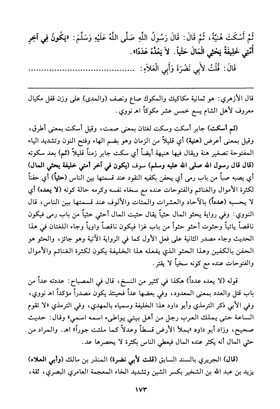 ثُم أَسْكَتَ هُنيَّةً، ثُم قَال: قَال رَسُولُ اللهِ صَلى اللهُ عَلَيهِ وَسَلمَ: "يَكُونُ فِي آخِرِ أُمَّتي خَلِيفَةٌ يَحثي الْمَال حَثْيًا. لَا يَعُدُّهُ عَدَدًا".