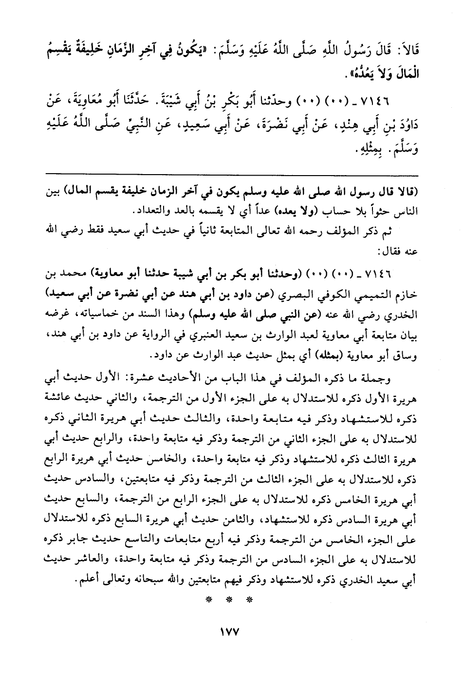 قَالا: قَال رَسُولُ اللهِ صَلى اللهُ عَلَيهِ وَسَلمَ: "يَكُونُ فِي آخِرِ الزمَانِ خَلِيفَةٌ يَقْسِمُ الْمَال وَلَا يَعُدُّهُ".
