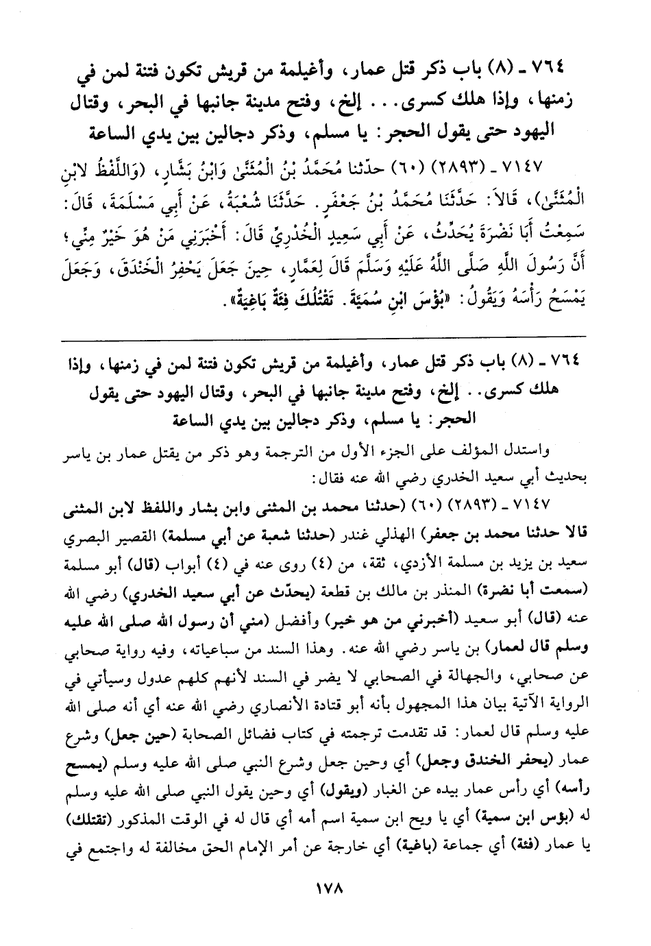 ٧١٤٧ - (٢٨٩٣) (٦٠) حدثنا مُحَمَّدُ بْنُ الْمُثَنَّى وَابْنُ بَشَّارٍ، (وَاللفْظُ لابْنِ الْمُثَنَّى)، قَالا: حَدَّثَنَا مُحَمدُ بْنُ جَعْفَرٍ. حَدَّثَنَا شُعْبَةُ، عَنْ أَبِي مَسْلَمَةَ، قَال: سَمِعْتُ أَبَا نَضْرَةَ يُحَدِّثُ، عَنْ أَبِي سَعِيدٍ الْخُدْرِيِّ قَال: أَخْبَرَنِي مَنْ هُوَ خَيرٌ مِني؛ أَن رَسُولَ اللهِ صَلى اللهُ عَلَيهِ وَسَلمَ قَال لِعَمَّارٍ، حِينَ جَعَلَ يَحْفِرُ الْخَنْدَقَ، وَجَعَلَ يَمْسَحُ رَأْسَهُ ويقُولُ: "بُؤْسَ ابْنِ سُمَيَّةَ. تَقْتُلُكَ فِئَةٌ بَاغِيَةٌ"