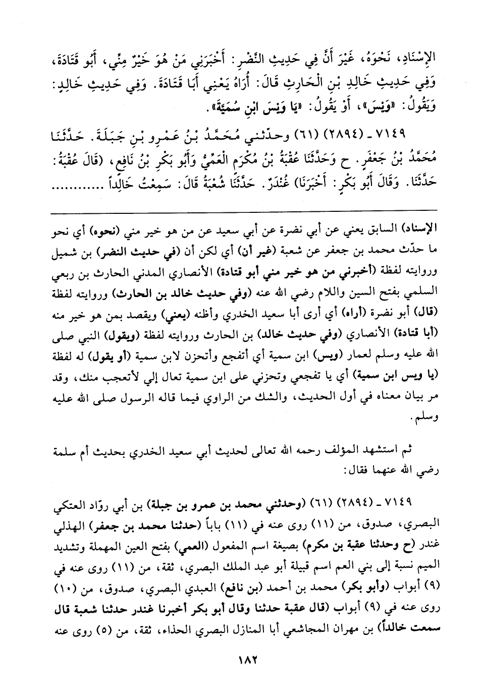 ٧١٤٩ - (٢٨٩٤) (٦١) (وحدثني محمد بن عمرو بن جبلة) بن أبي روّاد العتكي البصري، صدوق، من (١١) روى عنه في (١١) بابا (حدثنا محمد بن جعفر) الهذلي غندر (ح وحدثنا عقبة بن مكرم) بصيغة اسم المفعول (العمي) بفتح العين المهملة وتشديد الميم نسبة إلى بني العم اسم قبيلة أبو عبد الملك البصري، ثقة، من (١١) روى عنه في (٩) أبواب (وأبو بكر) محمد بن أحمد (بن نافع) العبدي البصري، صدوق، من (١٠) روى عنه في (٩) أبواب (قال عقبة حدثنا وقال أبو بكر أخبرنا غندر حدثنا شعبة قال سمعت خالدًا) بن مهران المجاشعي أبا المنازل البصري الحذاء، ثقة، من (٥) روى عنه