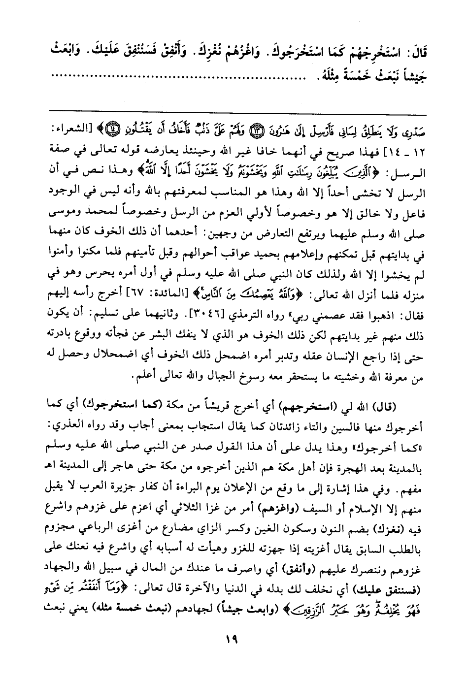 (قال) الله لي (استخرجهم) أي أخرج قريشًا من مكة (كما استخرجوك) أي كما أخرجوك منها فالسين والتاء زائدتان كما يقال استجاب بمعنى أجاب وقد رواه العذري: "كما أخرجوك" وهذا يدل على أن هذا القول صدر عن النبي صلى الله عليه وسلم بالمدينة بعد الهجرة فإن أهل مكة هم الذين أخرجوه من مكة حتى هاجر إلى المدينة اهـ مفهم. وفي هذا إشارة إلى ما وقع من الإعلان يوم البراءة أن كفار جزيرة العرب لا يقبل منهم إلا الإسلام أو السيف (واغزهم) أمر من غزا الثلاثي أي اعزم على غزوهم واشرع فيه (نغزك) بضم النون وسكون الجن وكسر الزاي مضارع من أغزى الرباعي مجزوم بالطلب السابق يقال أغزيته إذا جهزته للغزو وهيأت له أسبابه أي واشرع فيه نعنك على غزوهم وننصرك عليهم (وأنفق) أي واصرف ما عندك من المال في سبيل الله والجهاد (فسننفق عليك) أي نخلف لك بدله في الدنيا والآخرة قال تعالى: {وَمَا أَنْفَقْتُمْ مِنْ شَيءٍ فَهُوَ يُخْلِفُهُ وَهُوَ خَيرُ الرَّازِقِينَ} (وابعث جيشًا) لجهادهم (نبعث خمسة مثله) يعني نبعث