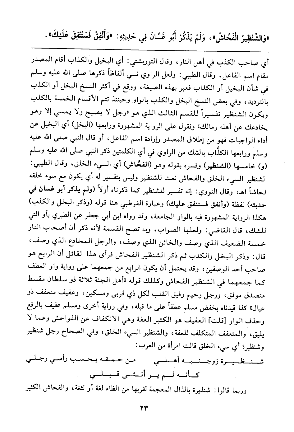 "وَالشِّنْظِيرُ الْفَحَّاشُ"، وَلَمْ يَذْكُرْ أَبُو غَسَّانَ فِي حَدِيثِهِ: "وَأَنْفِقْ فَسَنُنْفِقَ عَلَيكَ"