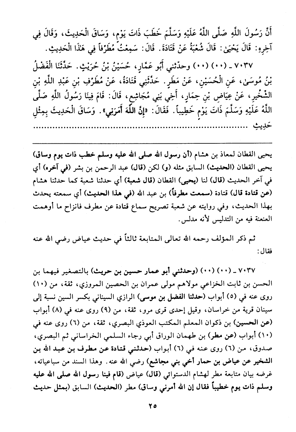 ٧٠٣٧ - (٠٠) (٠٠) وحدّثني أَبُو عَمَّارٍ، حُسَينُ بْنُ حُرَيثٍ. حَدَّثَنَا الفَضلُ بْنُ مُوسَى، عَنِ الحُسَينٍ، عَنْ مَطَرٍ. حَدَّثَنِي قَتَادَةُ، عَنْ مُطَرِّفِ بْنِ عَبْدِ اللهِ بْنِ الشِّخِّيرِ، عَنْ عِيَاضِ بْنِ حِمَارٍ، أَخِي بَنِي مُجَاشِعٍ، قَال: قَامَ فِينَا رَسُولُ اللهِ صَلَّى اللهُ عَلَيهِ وَسَلَّمَ ذَاتَ يَوْمٍ خَطِيبًا. فَقَال: "إِنَّ اللهَ أَمَرَنِي". وَسَاقَ الْحَدِيثَ بِمِثلِ حَدِيثِ
