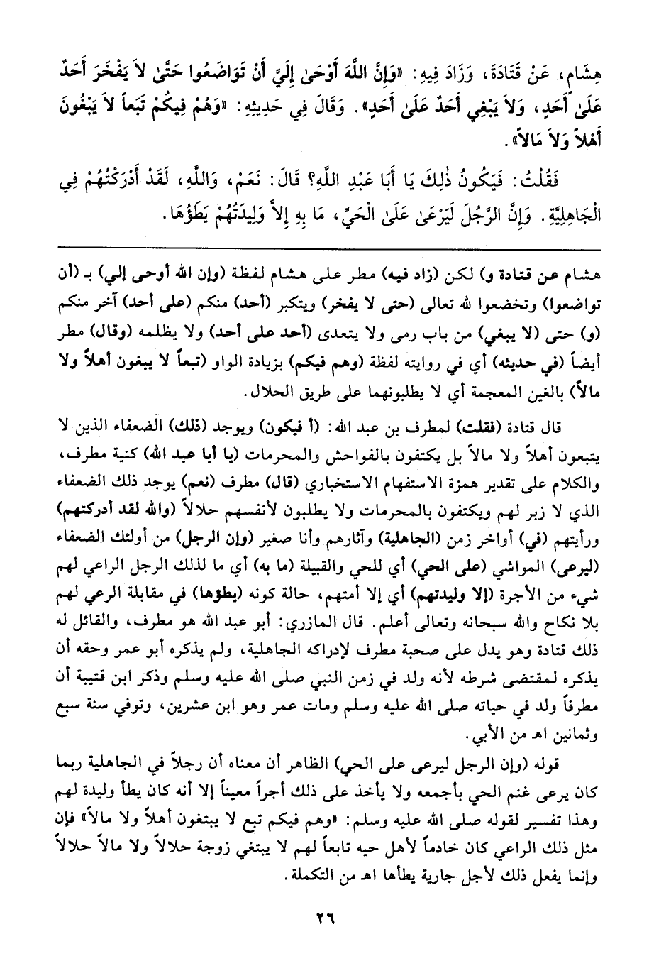 هِشَامٍ، عَنْ قَتَادَةَ، وَزَادَ فِيهِ: "وَإِنَّ اللهَ أَوْحَى إِلَيَّ أَنْ تَوَاضَعُوا حَتى لَا يَفْخَرَ أَحَدٌ عَلَى أَحَدٍ، وَلَا يَبْغِي أَحَدٌ عَلَى أَحَدٍ". وَقَال فِي حَدِيثِهِ: "وَهُمْ فِيكُمْ تَبَعًا لَا يَبْغُونَ أَهْلا وَلَا مَالًا".