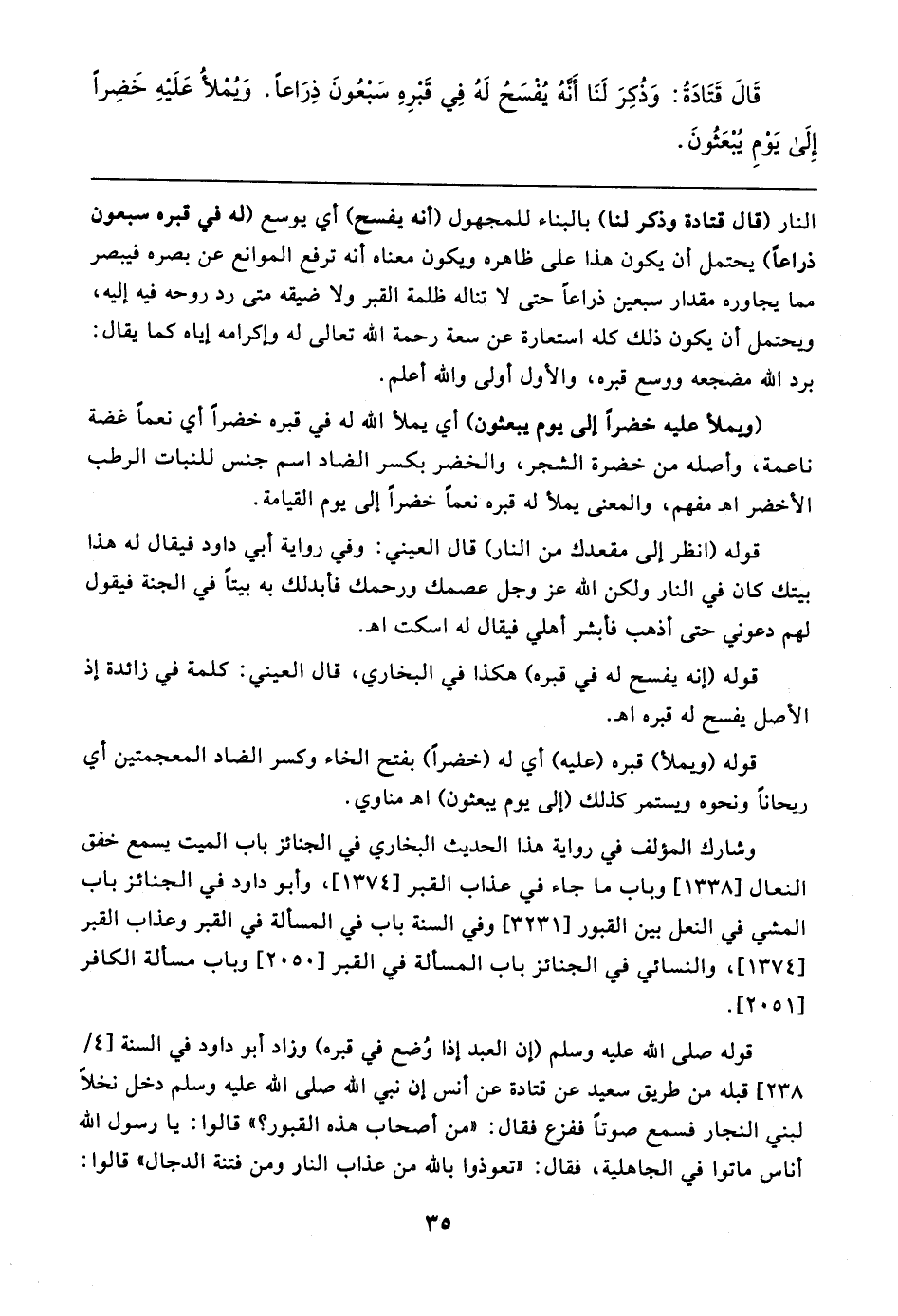 قَال قَتَادَةُ: وَذُكِرَ لَنَا أَنَّهُ يُفْسَحُ لَهُ فِي قَبْرِهِ سَبْعُونَ ذِرَاعًا. ويمْلأُ عَلَيهِ خَضِرًا إِلَى يَوْمِ يُبْعَثُونَ