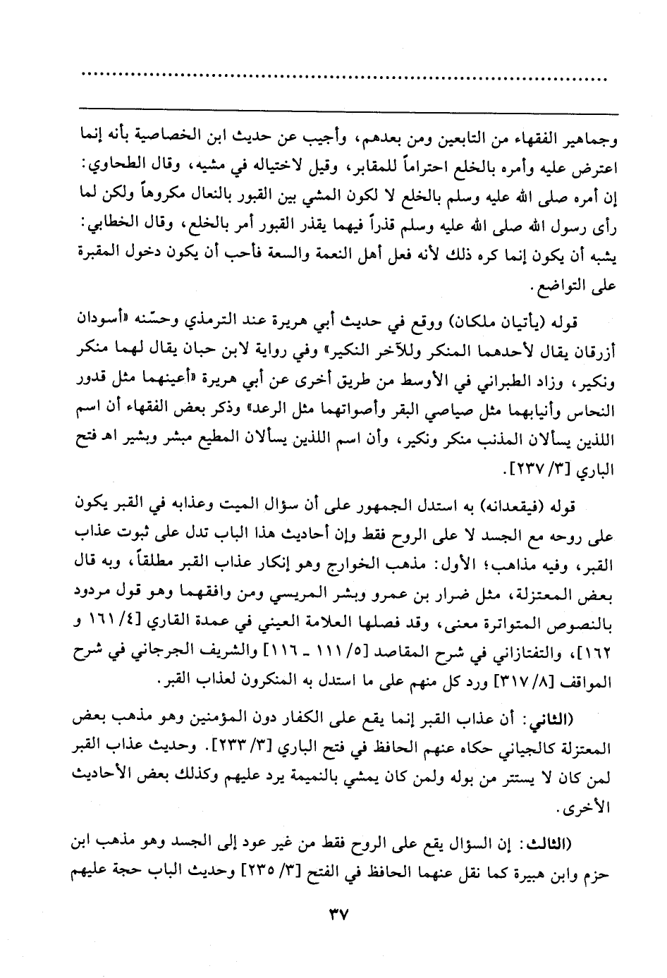 وجماهير الفقهاء من التابعين ومن بعدهم، وأجيب عن حديث ابن الخصاصية بأنه إنما اعترض عليه وأمره بالخلع احترامًا للمقابر، وقيل لاختياله في مشيه، وقال الطحاوي: إن أمره صلى الله عليه وسلم بالخلع لا لكون المشي بين القبور بالنعال مكروهًا ولكن لما رأى رسول الله صلى الله عليه وسلم قذرًا فيهما يقذر القبور أمر بالخلع، وقال الخطابي: يشبه أن يكون إنما كره ذلك لأنه فعل أهل النعمة والسعة فأحب أن يكون دخول المقبرة على التواضع.