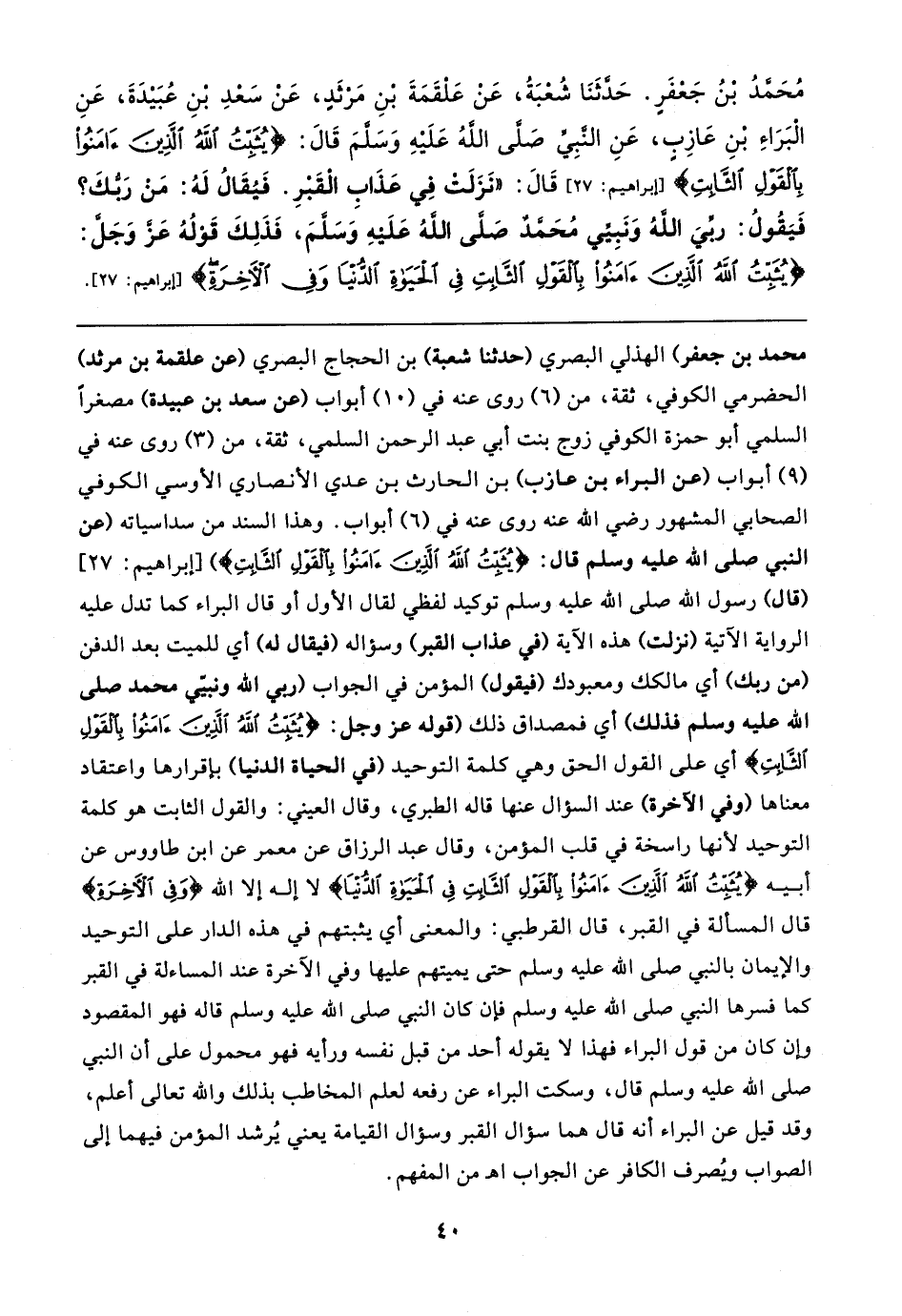 مُحَمَّدُ بْنُ جَعْفَرٍ. حَدَّثَنَا شُعْبَةُ، عَنْ عَلَّقَمَةَ بْنِ مَرْثَدٍ، عَنْ سَعْدِ بْنِ عُبَيدَةَ، عَنِ الْبَرَاءِ بْنِ عَازِب، عَنِ النَّبِيِّ صَلَّى اللهُ عَلَيهِ وَسَلَّمَ قَال: {يُثَبِّتُ اللَّهُ الَّذِينَ آمَنُوا بِالْقَوْلِ الثَّابِتِ} [إبراهيم: ٢٧] قَال: "نَزَلَتْ فِي عَذَابِ الْقَبرِ. فَيُقَالُ لَهُ: مَنْ رَبُّكَ؟ فَيَقُولُ: ربِّيَ اللهُ وَنَبِيِّي مُحَمَّدٌ صَلَّى اللهُ عَلَيهِ وَسَلَّمَ، فَذَلِكَ قَوْلُهُ عَز وَجَلَّ: {يُثَبِّتُ اللَّهُ الَّذِينَ آمَنُوا بِالْقَوْلِ الثَّابِتِ فِي الْحَيَاةِ الدُّنْيَا وَفِي الْآخِرَةِ} [إبراهيم: ٢٧]