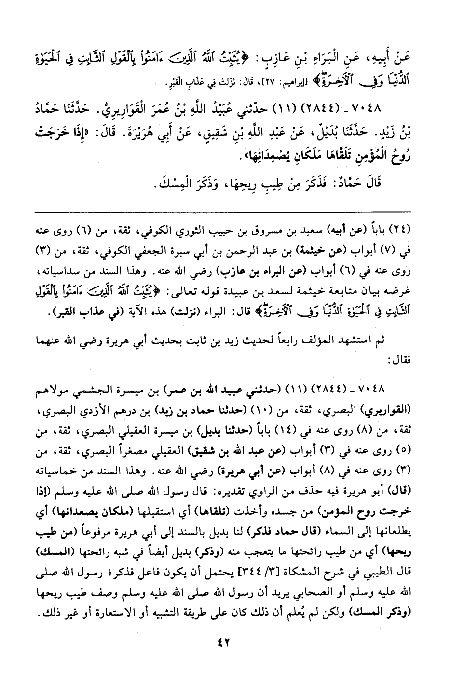 ٧٠٤٨ - (٢٨٤٤) (١١) (حدثني عبيد الله بن عمر) بن ميسرة الجشمي مولاهم (القواريري) البصري، ثقة، من (١٠) (حدثنا حماد بن زيد) بن درهم الأزدي البصري، ثقة، من (٨) روى عنه في (١٤) بابا (حدثنا بديل) بن ميسرة العقيلي البصري، ثقة، من (٥) روى عنه في (٣) أبواب (عن عبد الله بن شقيق) العقيلي مصغرًا البصري، ثقة، من (٣) روى عنه في (٨) أبواب (عن أبي هريرة) رضي الله عنه. وهذا السند من خماسياته (قال) أبو هريرة فيه حذف من الراوي تقديره: قال رسول الله صلى الله عليه وسلم (إذا خرجت روح المؤمن) من جسده وأخذت (تلقاها) أي استقبلها (ملكان يصعدانها) أي يطلعانها إلى السماء (قال حماد فذكر) لنا بديل بالسند إلى أبي هريرة مرفوعًا (من طيب ريحها) أي من طيب رائحتها ما يتعجب منه (وذكر) بديل أيضًا في شبه رائحتها (المسك) قال الطيبي في شرح المشكاة [٣/ ٣٤٤] يحتمل أن يكون فاعل فذكر؛ رسول الله صلى الله عليه وسلم أو الصحابي يريد أن رسول الله صلى الله عليه وسلم وصف طيب ريحها (وذكر المسك) ولكن لم يُعلم أن ذلك كان على طريقة التشبيه أو الاستعارة أو غير ذلك.