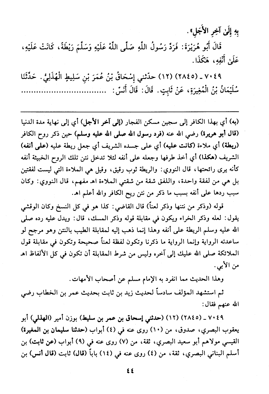 ٧٠٤٩ - (٢٨٤٥) (١٢) (حدثني إسحاق بن عمر بن سليط) بوزن أمير (الهذلي) أبو يعقوب البصري، صدوق، من (١٠) روى عنه في (٤) أبواب (حدثنا سليمان بن المغيرة) القيسي مولاهم أبو سعيد البصري، ثقة، من (٧) روى عنه في (٩) أبواب (عن ثابت) بن أسلم البناني البصري، ثقة، من (٤) روى عنه في (١٤) بابا (قال) ثابت (قال أنس) بن