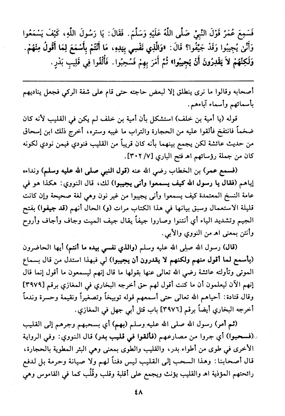 فَسَمِعَ عُمَرُ قَوْلَ النَّبِيِّ صَلَّى اللهُ عَلَيهِ وَسَلَّمَ. فَقَال: يَا رَسُولَ اللهِ، كَيفَ يَسْمَعُوا وَأَنى يُجِيبُوا وَقَدْ جَيَّفُوا؟ قَال: "وَالَّذِي نَفْسِي بِيَدِهِ، مَا أَنْتُمْ بِأَسْمَعَ مَعَ لِمَا أَقُولُ مِنْهُمْ. وَلَكِنَّهُمْ لَا يَقْدِرُونَ أَنَّ يُجِيبُوا" ثُمَّ أَمَرَ بِهِمْ فَسُحِبُوا. فَأُلقُوا فِي قَلِيبِ بَدْرٍ