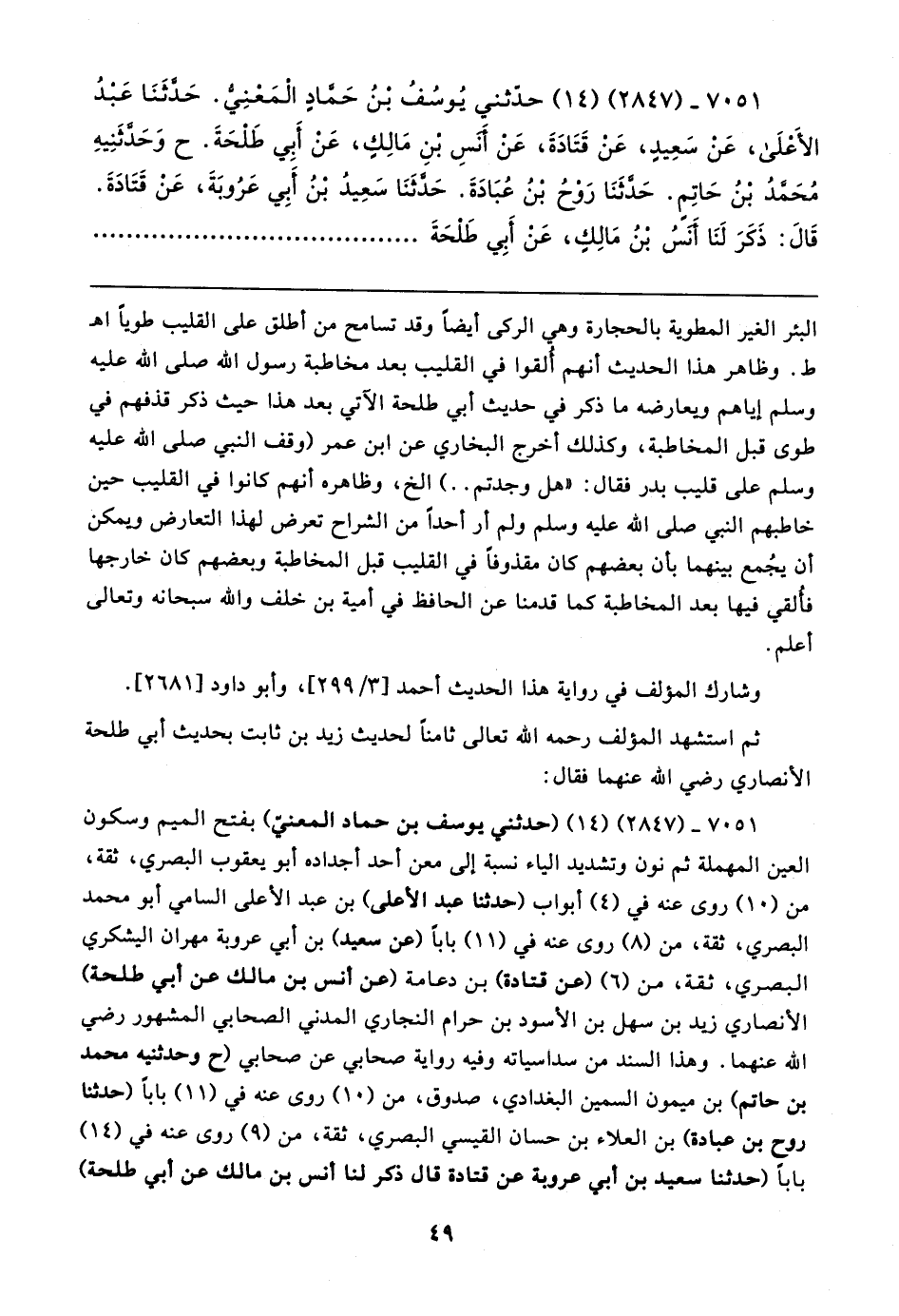 ٧٠٥١ - (٢٨٤٧) (١٤) حدّثني يُوسُفُ بْنُ حَمَّاد المَعْنِيُّ. حَدَّثَنَا عَبدُ الأَعْلَى، عَنْ سَعِيدٍ، عَنْ قَتَادَةَ، عَنْ أَنسِ بْنِ مَالِكٍ، عَنْ أَبِي طَلْحَةَ. ح وَحَدَّثَنِيهِ مُحَمَّدُ بْنُ حَاتِمٍ. حَدَّثَنَا رَوْحُ بْنُ عُبَادَةَ. حَدَّثَنَا سَعِيدُ بْنُ أَبِي عَرُوبَةَ، عَنْ قَتَادَةَ. قَال: ذَكَرَ لَنَا أَنسُ بْنُ مَالِكٍ، عَنْ أَبِي طَلْحَةَ