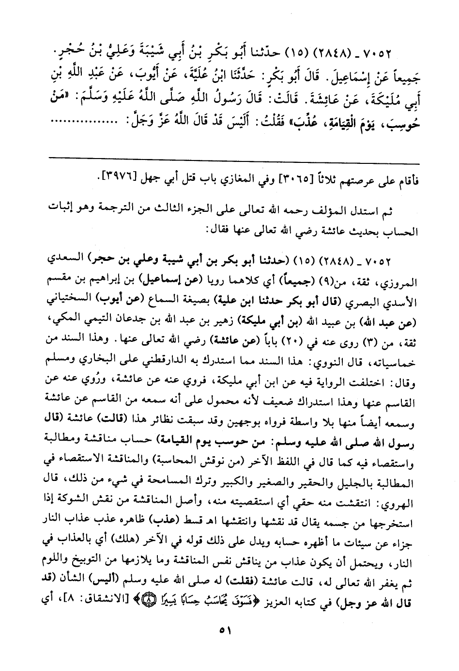 ٧٠٥٢ - (٢٨٤٨) (١٠) (حدثنا أبو بكر بن أبي شيبة وعلي بن حجر) السعدي المروزي، ثقة، من (٩) (جميعًا) أي كلاهما رويا (عن إسماعيل) بن إبراهيم بن مقسم الأسدي البصري (قال أبو بكر حدثنا ابن علية) بصيغة السماع (عن أيوب) السختياني (عن عبد الله) بن عبيد الله (بن أبي مليكة) زهير بن عبد الله بن جدعان التيمي المكي، ثقة، من (٣) روى عنه في (٢٠) بابا (عن عائشة) رضي الله تعالى عنها. وهذا السند من خماسياته، قال النووي: هذا السند مما استدرك به الدارقطني على البخاري ومسلم وقال: اختلفت الرواية فيه عن ابن أبي مليكة، فروي عنه عن عائشة، ورُوي عنه عن القاسم عنها وهذا استدراك ضعيف لأنه محمول على أنه سمعه من القاسم عن عائشة وسمعه أيضًا منها بلا واسطة فرواه بوجهين وقد سبقت نظائر هذا (قالت) عائشة (قال رسول الله صلى الله عليه وسلم: من حوسب يوم القيامة) حساب مناقشة ومطالبة واستقصاء فيه كما قال في اللفظ الآخر (من نوقش المحاسبة) والمناقشة الاستقصاء في المطالبة بالجليل والحقير والصغير والكبير وترك المسامحة في شيء من ذلك، قال الهروي: انتقشت منه حقي أي استقصيته منه، وأصل المناقشة من نقش الشوكة إذا استخرجها من جسمه يقال قد نقشها وانتقشها اهـ قسط (عذب) ظاهره عذب عذاب النار جزاء عن سيئات ما أظهره حسابه ويدل على ذلك قوله في الآخر (هلك) أي بالعذاب في النار، ويحتمل أن يكون عذاب من يناقش نفس المناقشة وما يلازمها من التوبيخ واللوم ثم يغفر الله تعالى له، قالت عائشة (فقلت) له صلى الله عليه وسلم (أليس) الشأن (قد قال الله عزَّ وجلَّ) في كتابه العزيز {فَسَوْفَ يُحَاسَبُ حِسَابًا يَسِيرًا (٨)} [الانشقاق: ٨]، أي