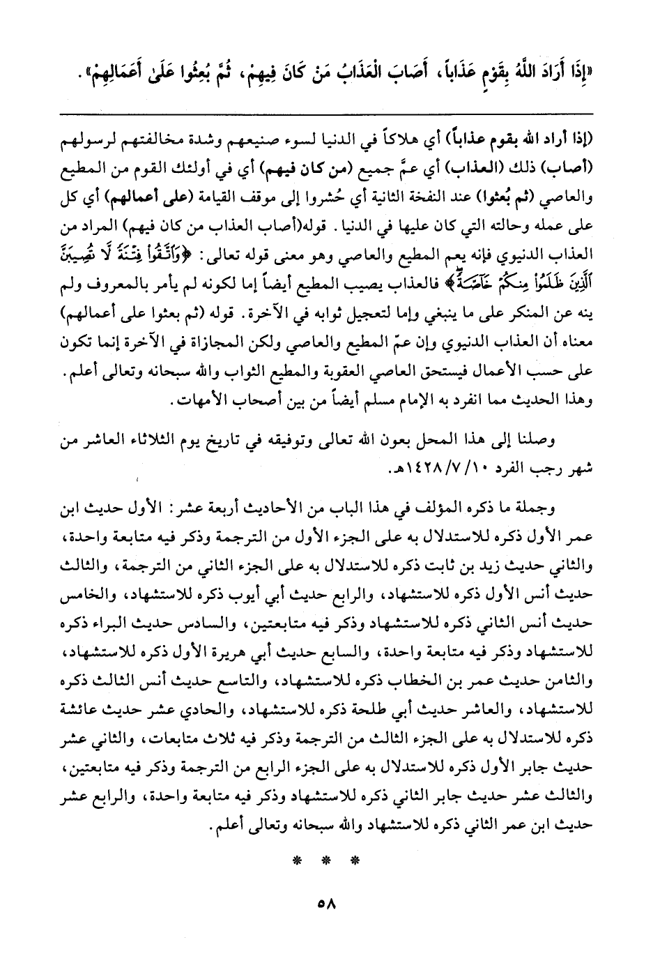 "إِذَا أَرَادَ اللهُ بِقَوْمٍ عَذَابًا، أَصَابَ الْعَذَابُ مَنْ كَانَ فِيهِمْ، ثُمَّ بُعِثُوا عَلَى أَعَمَالِهِمْ"