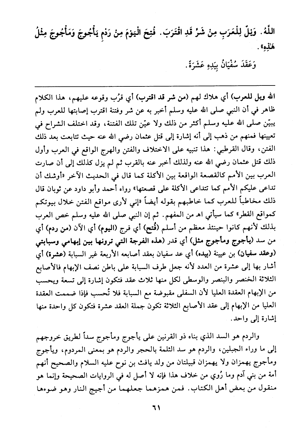الله ويل للعرب) أي هلاك لهم (من شر قد اقترب) أي قرُب وقوعه عليهم، هذا الكلام ظاهر في أن النبي صلى الله عليه وسلم أخبر به عن شر وفتنة اقترب إصابتها للعرب ولم يبيّن صلى الله عليه وسلم أكثر من ذلك ولا عيّن تلك الفتنة، وقد اختلف الشراح في تعيينها فمنهم من ذهب إلى أنه إشارة إلى قتل عثمان رضي الله عنه حيث تتابعت بعد ذلك الفتن، وقال القرطبي: هذا تنبيه على الاختلاف والفتن والهرج الواقع في العرب وأول ذلك قتل عثمان رضي الله عنه ولذلك أخبر عنه بالقرب ثم لم يزل كذلك إلى أن صارت العرب بين الأمم كالقصعة الواقعة بين الأكلة كما قال في الحديث الآخر "أوشك أن تداعى عليكم الأمم كما تتداعى الأكلة على قصعتها" رواه أحمد وأبو داود عن ثوبان قال ذلك مخاطبًا للعرب كما خاطبهم بقوله أيضًا "إني لأرى مواقع الفتن خلال بيوتكم كمواقع القطر" كما سيأتي اهـ من المفهم. ثم إن النبي صلى الله عليه وسلم خص العرب بذلك لأنهم كانوا حينئذ معظم من أسلم (فُتح) أي فرج (اليوم) أي الآن (من ردم) أي من سد (يأجوج ومأجوج مثل) أي قدر (هذه الفرجة التي ترونها بين إبهامي وسبابتي (وعقد سفيان) بن عيينة (بيده) أي عد سفيان بعقد أصابعه الأربعة غير السبابة (عشرة) أي أشار بها إلى عشرة من العدد لأنه جعل طرف السبابة على باطن نصف الإبهام فالأصابع الثلاثة الخنصر والبنصر والوسطى لكل منها ثلاث عقد فتكون إشارة إلى تسعة ويحسب من الإبهام العقدة العليا لأن السفلى مقبوضة مع السبابة فلا تُحسب فإذا ضممت العقدة العليا من الإبهام إلى عقد الأصابع الثلاثة تكون جملة العقد عشرة فتكون كل واحدة منها إشارة إلى واحد.
