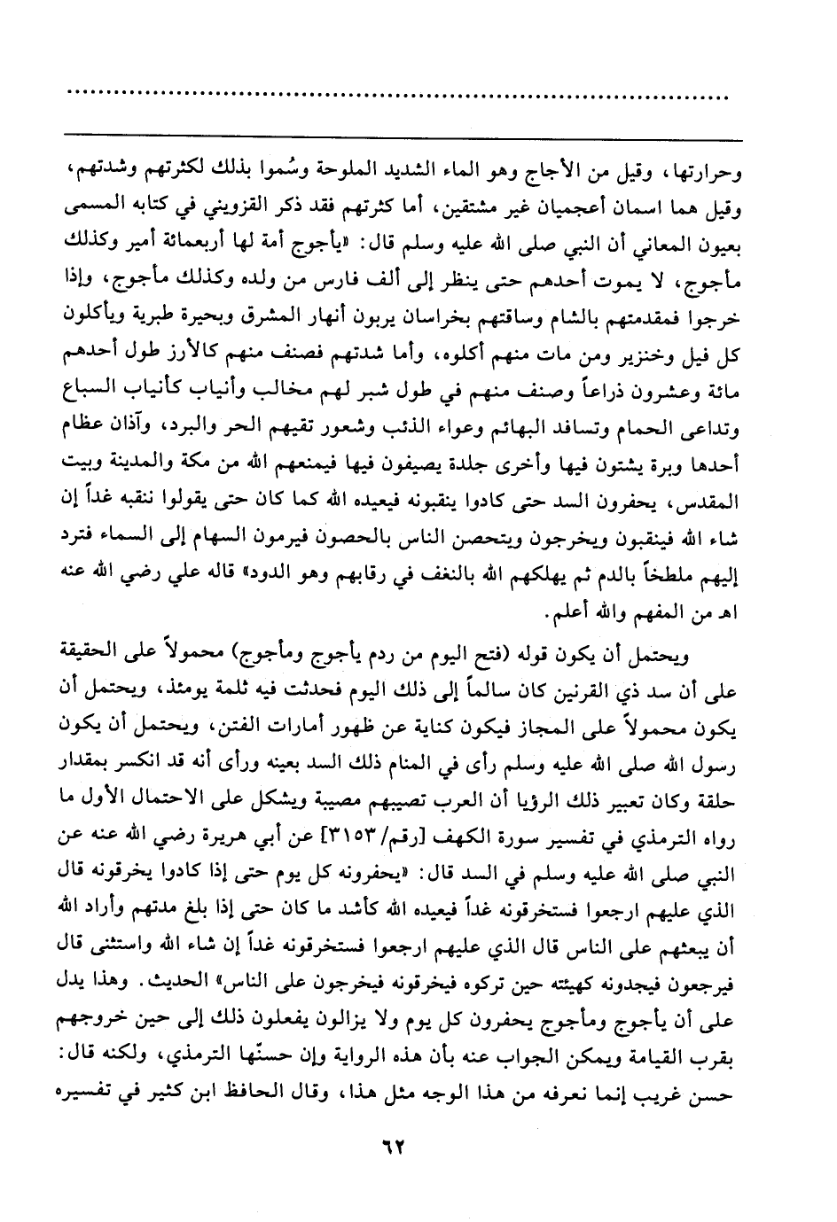 وحرارتها، وقيل من الأجاج وهو الماء الشديد الملوحة وسُموا بذلك لكثرتهم وشدتهم، وقيل هما اسمان أعجميان غير مشتقين، أما كثرتهم فقد ذكر القزويني في كتابه المسمى بعيون المعاني أن النبي صلى الله عليه وسلم قال: "يأجوج أمة لها أربعمائة أمير وكذلك مأجوج، لا يموت أحدهم حتى ينظر إلى ألف فارس من ولده وكذلك مأجوج، وإذا خرجوا فمقدمتهم بالشام وساقتهم بخراسان يربون أنهار المشرق وبحيرة طبرية ويأكلون كل فيل وخنزير ومن مات منهم أكلوه، وأما شدتهم فصنف منهم كالأرز طول أحدهم مائة وعشرون ذراعًا وصنف منهم في طول شبر لهم مخالب وأنياب كأنياب السباع وتداعى الحمام وتسافد البهائم وعواء الذئب وشعور تقيهم الحر والبرد، وآذان عظام أحدها وبرة يشتون فيها وأخرى جلدة يصيفون فيها فيمنعهم الله من مكة والمدينة وبيت المقدس، يحفرون السد حتى كادوا ينقبونه فيعيده الله كما كان حتى يقولوا ننقبه غدًا إن شاء الله فينقبون ويخرجون ويتحصن الناس بالحصون فيرمون السهام إلى السماء فترد إليهم ملطخًا بالدم ثم يهلكهم الله بالنغف في رقابهم وهو الدود" قاله علي رضي الله عنه اهـ من المفهم والله أعلم.