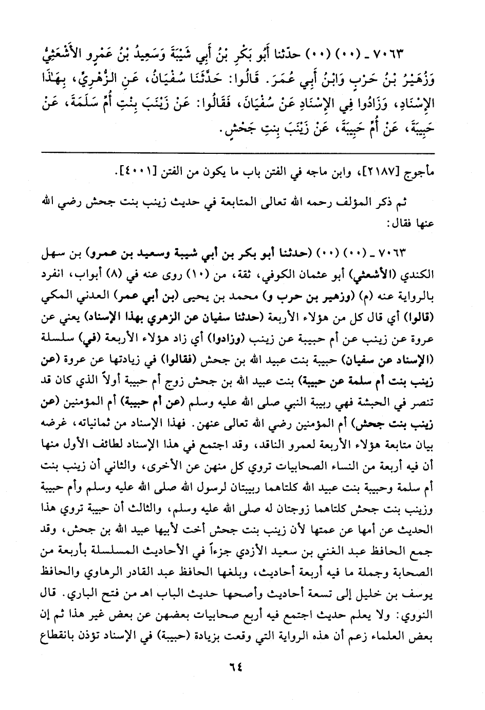 ٧٠٦٣ - (٠٠) (٠٠) حدَّثنا أَبُو بَكرٍ بْنُ أَبِي شَيبَةَ وَسَعِيدُ بْنُ عَمْرٍو الأَشعَثِيُّ وَزُهَيرُ بْنُ حَرْبٍ وَابنُ أَبِي عُمَرَ. قَالُوا: حَدَّثَنَا سُقيَانُ، عَنِ الزُّهْرِيِّ، بِهَذا الإِسْنَادِ، وَزَادُوا فِي الإِسْنَادِ عَنْ سُفْيَانَ، فَقَالُوا: عَنْ زَينَبَ بِنتِ أُمِّ سَلَمَةَ، عَنْ حَبِيبَةَ، عَنْ أُمِّ حَبِيبَةَ، عَنْ زَينَبَ بِنتِ جَحْشٍ