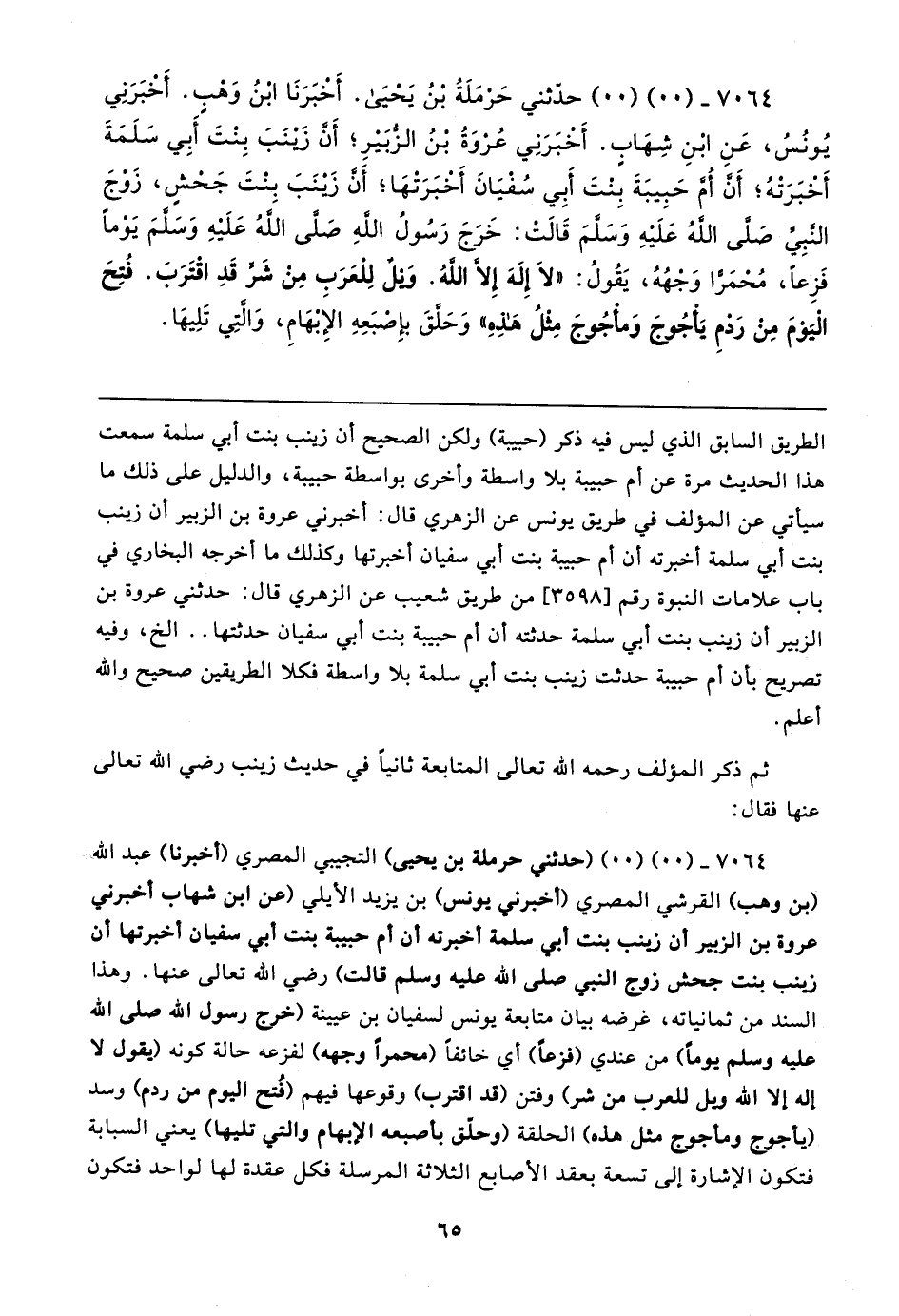 ٧٠٦٤ - (٠٠) (٠٠) حدّثني حَرْمَلَةُ بْنُ يَحْيَى. أَخبَرَنَا ابْنُ وَهْبٍ. أَخبَرَنِي يُونُسُ، عَنِ ابْنِ شِهَابٍ. أَخبَرَنِي عُرْوَةُ بْنُ الزُّبَيرِ؛ أَنَّ زَينَبَ بِنْتَ أَبِي سَلَمَةَ أَخبَرَتْهُ؛ أَنَّ أُمَّ حَبِيبَةَ بِنْتَ أَبِي سُفْيَانَ أَخبَرَتهَا؛ أَنَّ زَينَبَ بِنْتَ جَحشٍ، زَوْجَ النَّبِيِّ صَلَّى اللهُ عَلَيهِ وَسَلَّمَ قَالتْ: خَرَجَ رَسُولُ اللهِ صَلَّى اللهُ عَلَيهِ وَسَلَّمَ يَوْمًا فَزِعًا، مُحْمَرًّا وَجْهُهُ، يَقُولُ: "لَا إِلَهَ إلَّا اللهُ. وَيلٌ لِلْعَرَبِ مِنْ شَرٍّ قَدِ اقْتَرَبَ. فُتِحَ الْيَوْمَ مِنْ رَدْمِ يَأْجُوجَ وَمأجُوجَ مِثْلُ هَذِهِ" وَحَلَّقَ بإِصْبَعِهِ الإِبْهَامِ، وَالَّتِي تَلِيهَا