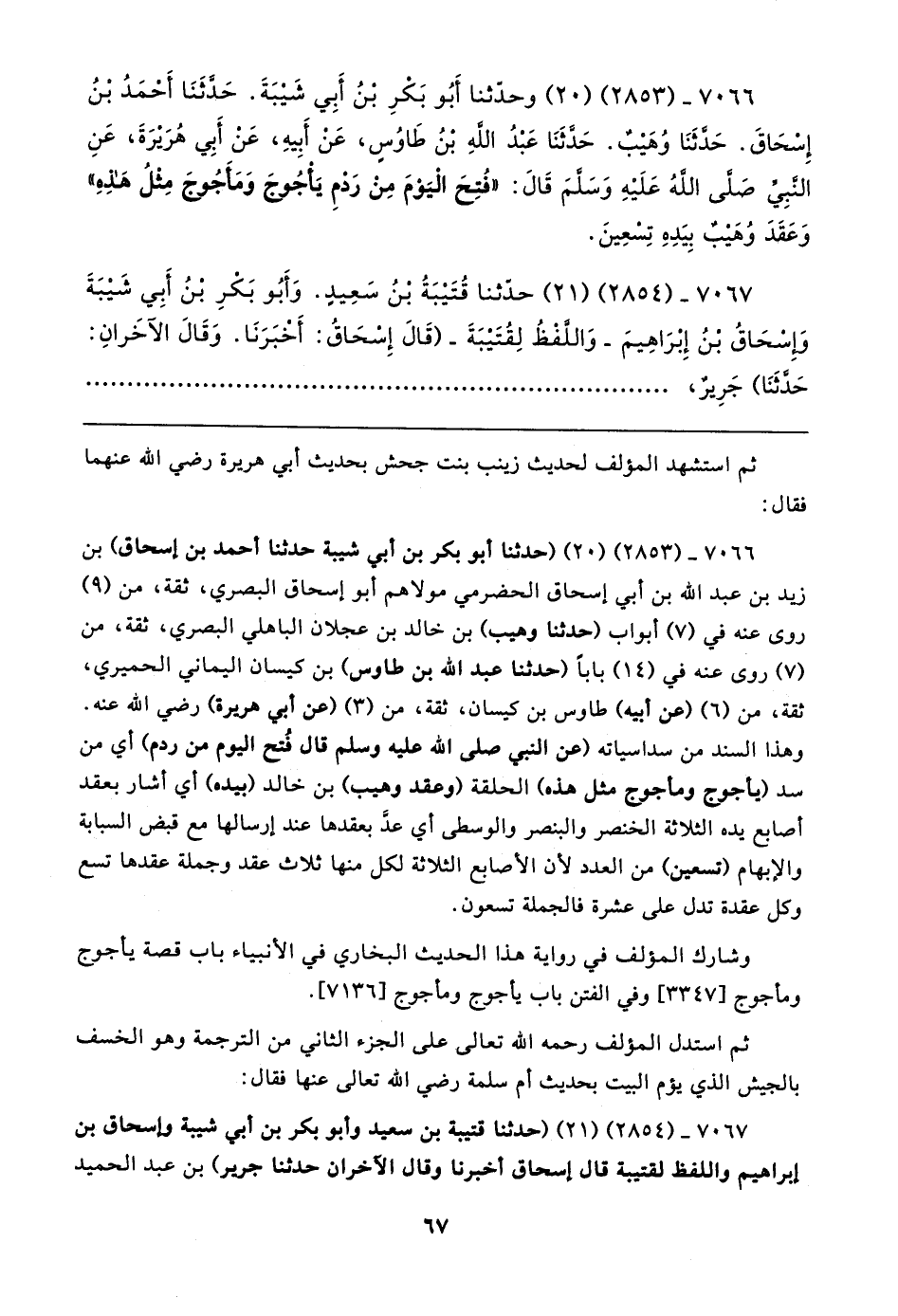 ٧٠٦٦ - (٢٨٥٣) (٢٠) (حدثنا أبو بكر بن أبي شيبة حدثنا أحمد بن إسحاق) بن زيد بن عبد الله بن أبي إسحاق الحضرمي مولاهم أبو إسحاق البصري، ثقة، من (٩) روى عنه في (٧) أبواب (حدثنا وهيب) بن خالد بن عجلان الباهلي البصري، ثقة، من (٧) روى عنه في (١٤) بابا (حدثنا عبد الله بن طاوس) بن كيسان اليماني الحميري، ثقة، من (٦) (عن أبيه) طاوس بن كيسان، ثقة، من (٣) (عن أبي هريرة) رضي الله عنه. وهذا السند من سداسياته (عن النبي صلى الله عليه وسلم قال فُتح اليوم من ردم) أي من سد (يأجوج ومأجوج مثل هذه) الحلقة (وعقد وهيب) بن خالد (بيده) أي أشار بعقد أصابع يده الثلاثة الخنصر والبنصر والوسطى أي عدَّ بعقدها عند إرسالها مع قبض السبابة والإبهام (تسعين) من العدد لأن الأصابع الثلاثة لكل منها ثلاث عقد وجملة عقدها تسع وكل عقدة تدل على عشرة فالجملة تسعون.