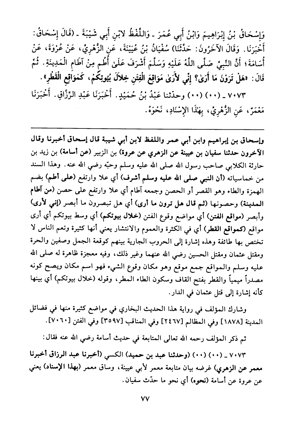 وَإِسْحَاقُ بْنُ إِبْرَاهِيمَ وَابْنُ أبِي عُمَرَ -وَاللَّفْظُ لابْنِ أبِي شَيبَةَ- (قَال إِسْحَاقُ: أَخبَرَنَا. وَقَال الآخَرُونَ: حَدَّثَنَا) سُفْيَانُ بْنُ عُيَينَةَ، عَغ الزُّهْرِيِّ، عَنْ عُرْوَةَ، عَنْ أُسَامَةَ؛ أَنَّ النَّبِيَّ صَلَّى اللهُ عَلَيهِ وَسَلَّمَ أَشْرَفَ عَلَى أُطُم مِنْ آطَامِ الْمَدِينَةِ. ثُمَّ قَال: "هَل تَرَوْنَ مَا أَرَى؟ إِنِّي لأَرَى مَوَاقِعَ الْفِتَنِ خِلال بُيُوتكُمْ، كَمَوَاقِعِ الْقَطرِ".