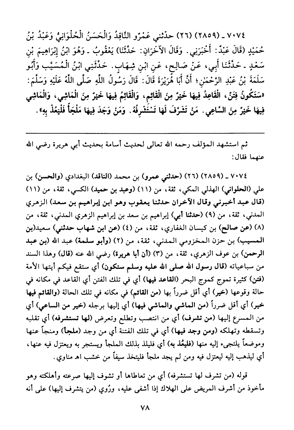 ٧٠٧٤ - (٢٨٥٩) (٢٦) حدّثني عَمْرٌو النَّاقِدُ وَالحَسَنُ الْحُلْوَانِيُّ وَعَبْدُ بْنُ حُمَيدٍ (قَال عَبْدٌ: أَخْبَرَنِي. وَقَال الآخَرَانِ: حَدَّثَنَا) يَعْقُوبُ -وَهُوَ ابْنُ إِبرَاهِيمَ بْنِ سَعْدٍ- حَدَّثَنَا أَبِي، عَنْ صَالِحٍ، عَنِ ابْنِ شِهَابٍ. حَدَّثَنِي ابْنُ الْمُسَيَّب وَأَبُو سَلَمَةَ بْنُ عَبْدِ الرَّحْمَنِ؛ أَنَّ أَبَا هُرَيرَةَ قَال: قَال رَسُولُ اللهِ صَلَّى اللَّهُ عَلَيهِ وَسَلَّمَ: "سَتَكُونُ فِتَنٌ، القَاعِدُ فِيهَا خَيرٌ مِنَ الْقَائِمِ، وَالْقَائِمُ فِيهَا خَيرٌ مِنَ الْمَاشِي، وَالْمَاشِي فِيهَا خَيرٌ مِنَ السَّاعِي. مَنْ تَشَرَّفَ لَهَا تَستَشرِفُهُ. وَمَنْ وَجَدَ فِيهَا مَلْجَأً فَلْيَعُذْ بِهِ"