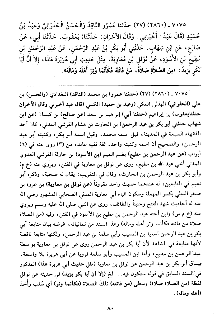 ٧٠٧٥ - (٢٨٦٠) (٢٧) (حدثنا عمرو) بن محمد (الناقد) البغدادي (والحسن) بن علي (الحلواني) الهذلي المكي (وعبد بن حميد) الكسي (قال عبد أخبرني وقال الآخران حدثنا يعقوب) بن إبراهيم (حدثنا أبي) إبراهيم بن سعد (عن صالح) بن كيسان (عن ابن شهاب حدثني أبو بكر بن عبد الرحمن) بن الحارث بن هشام القرشي المدني، كان أحد الفقهاء السبعة في المدينة، قبل اسمه محمد، وقيل اسمه أبو بكر، وكنيته أبو عبد الرحمن، والصحيح أن اسمه وكنيته واحد، ثقة فقيه عابد، من (٣) روى عنه في (٦) أبواب (عن عبد الرحمن بن مطيع) بضم الميم (بن الأسود) بن حارثة القرشي العدوي المدني أخي عبد الله بن مطيع، روى عن نوفل بن معاوية في الفتن، ويروي عنه (خ م) وأبو بكر بن عبد الرحمن بن الحارث، وقال في التقريب: يقال له صحبة، وذكره أبو نعيم في التابعين، له عندهما حديث واحد مقرونًا (عن نوفل بن معاوية) بن عروة بن صخر الديلي بكسر المهملة وسكون الياء أبي معاوية المدني الصحابي المشهور رضي الله عنه له أحاديث شهد الفتح وحنينًا والطائف، روى عن النبي صلى الله عليه وسلم ويروي عنه (خ م س) وابن أخته عبد الرحمن بن مطيع بن الأسود في الفتن، وفيه (من الصلاة صلاة من فاتته فكأنما وتر أهله وماله) وهذا السند من ثمانياته، غرضه بيان متابعة أبي بكر بن عبد الرحمن لسعيد بن المسيب وأبي سلمة بن عبد الرحمن، ولكنها متابعة ناقصة لأنها متابعة في الشاهد لأن أبا بكر بن عبد الرحمن روى عن نوفل بن معاوية بواسطة عبد الرحمن بن مطيع، وأما ابن المسيب وأبو سلمة فرويا عن أبي هريرة بلا واسطة، وساق أبو بكر بن عبد الرحمن عن نوفل بن معاوية (مثل حديث أبي هريرة هذا) المذكور في السند السابق في قوله ستكون فيه .. الخ (إلا أن أبا بكر يزيد) في حديثه عن نوفل لفظة (من الصلاة صلاة) وسطى (من فاتته) تلك الصلاة (فكأنما وتر) أي سُلب وأُخذ (أهله وماله).