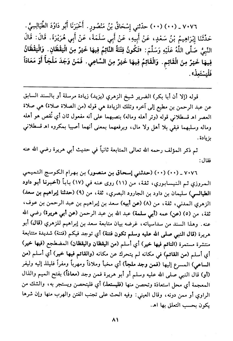 ٧٠٧٦ - (٠٠) (٠٠) حدّثني إِسْحَاقُ بْنُ مَنْصُورٍ. أَخبَرَنَا أَبُو دَاوُدَ الطَّيَالِسِيُّ. حَدَّثَنَا إِبْرَاهِيمُ بْنُ سَعْدٍ، عَنْ أَبِيهِ، عَنْ أَبِي سَلَمَةَ، عَن أَبِي هُرَيرَةَ. قَال: قَال النَّبِيُّ صَلَّى اللهُ عَلَيهِ وَسَلَّمَ: "تَكُونُ فِتنَةٌ النَّائِمُ فِيهَا خَيرٌ مِنَ الْيَقْظَانِ. وَالْيَقْظَانُ فِيهَا خَيرٌ مِنَ الْقَائِمِ. وَالْقَائِمُ فِيهَا خَيرٌ مِنَ السَّاعِي. فَمَنْ وَجَدَ مَلْجَأً أَوْ مَعَاذًا فَلْيَسْتَعِذْ"