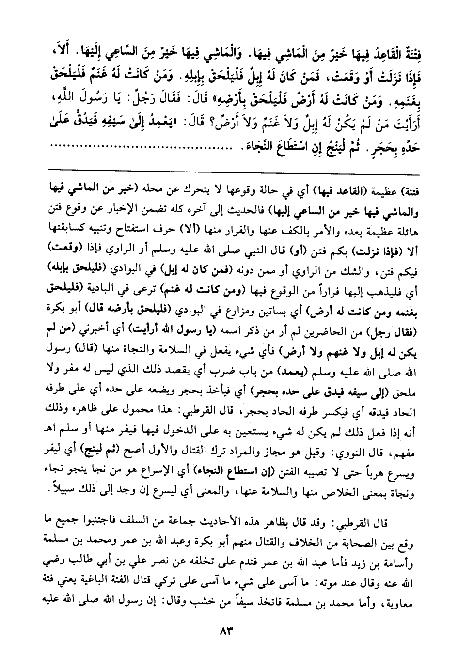 فِتْنَةٌ الْقَاعِدُ فِيهَا خَيرٌ مِنَ الْمَاشِي فِيهَا. وَالْمَاشِي فِيهَا خَيرٌ مِنَ السَّاعِي إِلَيهَا. أَلا، فَإِذَا نَزَلَتْ أَوْ وَقَعَتْ، فَمَنْ كَانَ لَهُ إِبِلٌ فَلْيَلْحَقْ بِإِبلِهِ. وَمَنْ كَانَتْ لَهُ غَنَمٌ فَلْيَلْحَقْ بِغَنَمِهِ. وَمَنْ كَانَتْ لَهُ أَرْضٌ فَلْيَلْحَقْ بِأَرْضْهِ" قَال: فَقَال رَجُلٌ: يَا رَسُولَ اللهِ، أَرَأَيتَ مَنْ لَمْ يَكُنْ لَهُ إِبِلٌ وَلَا غَنَمٌ وَلَا أَرْضٌ؟ قَال: "يَعْمِدُ إِلَى سَيفِهِ فَيَدُقُّ عَلَى حَدِّهِ بِحَجَرٍ. ثُمَّ لْيَنْجُ إِنِ اسْتَطَاعَ النَّجَاءَ