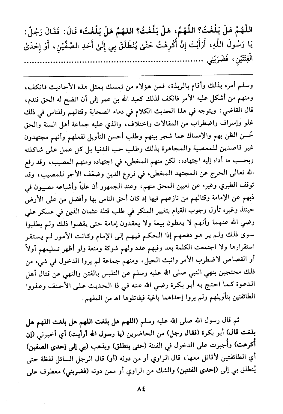 ثم قال رسول الله صلى الله عليه وسلم (اللهم هل بلغت اللهم هل بلغت اللهم هل بلغت قال) أبو بكرة (فقال رجل) من الحاضرين (يا رسول الله أرأيت) أي أخبرني (إن كُرهت) وأجبرت على الدخول في الفتنة (حتى ينطلق) ويذهب (بي إلى إحدى الصفين) أي الطائفتين لأقاتل معها، قال الراوي أو من دونه (أو) قال الرجل السائل لفظة حتى يُنطلق بي إلى (إحدى الفئتين) والشك من الراوي أو ممن دونه (فضربني) معطوف على