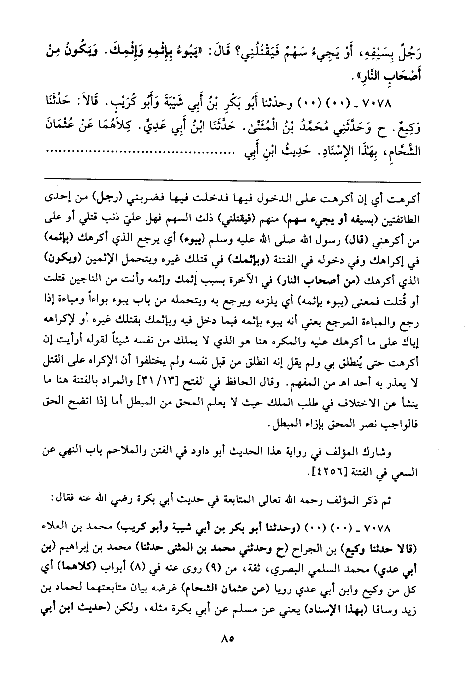 ثم ذكر المؤلف رحمه الله تعالى المتابعة في حديث أبي بكرة رضي الله عنه فقال: ٧٠٧٨ - (٠٠) (٠٠) (وحدثنا أبو بكر بن أبي شيبة وأبو كريب) محمد بن العلاء (قالا حدثنا وكيع) بن الجراح (ح وحدثني محمد بن المثنى حدثنا) محمد بن إبراهيم (بن أبي عدي) محمد السلمي البصري، ثقة، من (٩) روى عنه في (٨) أبواب كلاهما) أي كل من وكيع وابن أبي عدي رويا (عن عثمان الشحام) غرضه بيان متابعتهما لحماد بن زيد وساقا (بهذا الإسناد) يعني عن مسلم عن أبي بكرة مثله، ولكن (حديث ابن أبي