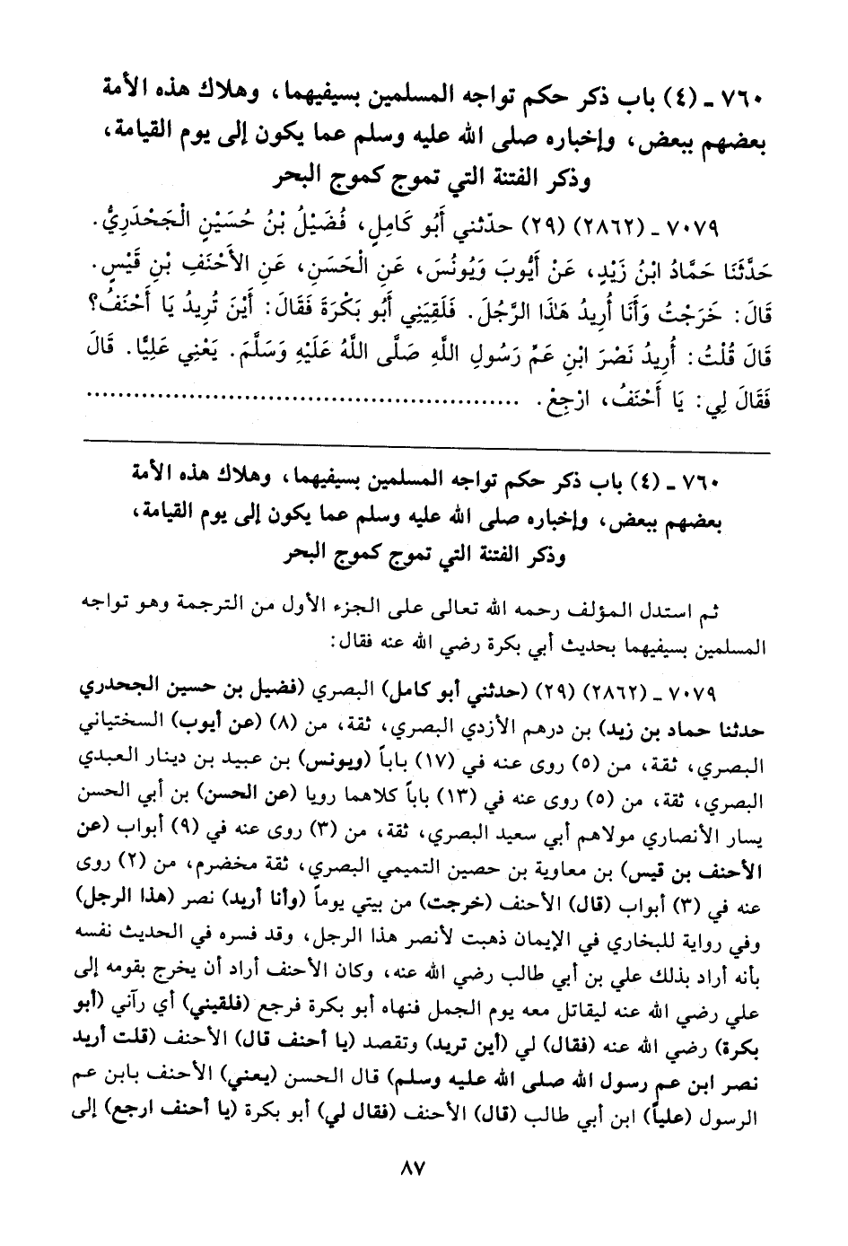 ٧٠٧٩ - (٢٨٦٢) (٢٩) حدّثني أَبُو كَامِلٍ، فُضَيلُ بْنُ حُسَينٍ الْجَحْدَرِيُّ. حَدَّثَنَا حَمَّادُ بْنُ زَيدٍ، عَنْ أَيُّوبَ ويونُسَ، عَنِ الْحَسَنِ، عَنِ الأَحْنَفِ بْنِ قَيسٍ. قَال: خَرَجْتُ وَأَنَا أُرِيدُ هَذَا الرَّجُلَ. فَلَقِيَنِي أَبُو بَكرَةَ فَقَال: أَينَ تُرِيدُ يَا أَحْنَفُ؟ قَال قُلْتُ: أُرِيدُ نَصْرَ ابْنِ عَمِّ رَسُولِ اللهِ صَلَّى اللهُ عَلَيهِ وَسَلَّمَ. يَعْنِي عَلِيًّا. قَال فَقَال لِي: يَا أَحْنَفُ، ارْجِعْ