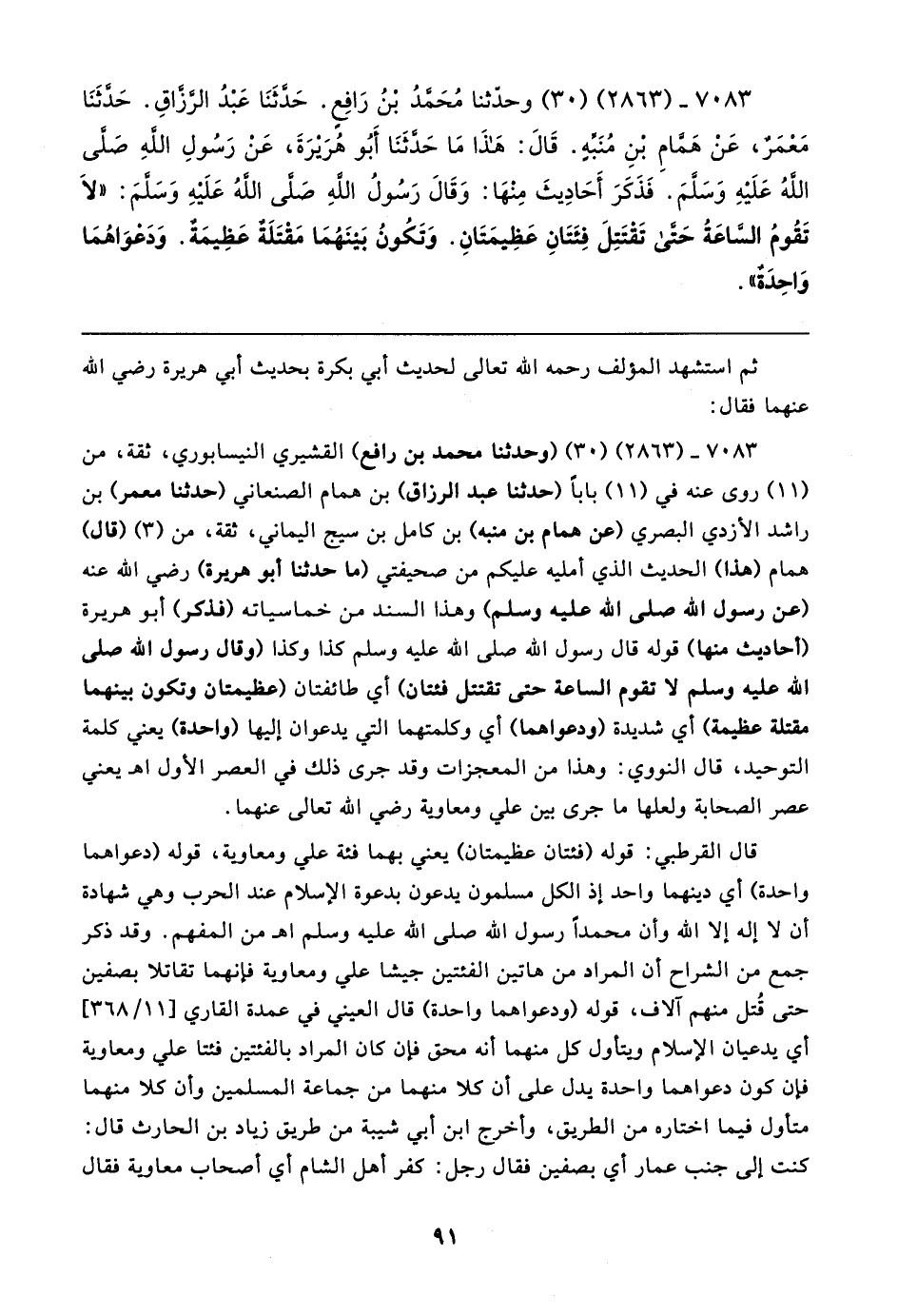 ٧٠٨٣ - (٢٨٦٣) (٣٠) (وحدثنا محمد بن رافع) القشيري النيسابوري، ثقة، من (١١) روى عنه في (١١) بابا (حدثنا عبد الرزاق) بن همام الصنعاني (حدثنا معمر) بن راشد الأزدي البصري (عن همام بن منبه) بن كامل بن سريج اليماني، ثقة، من (٣) (قال) همام (هذا) الحديث الذي أمليه عليكم من صحيفتي (ما حدثنا أبو هريرة) رضي الله عنه (عن رسول الله صلى الله عليه وسلم) وهذا السند من خماسياته (فدكر) أبو هريرة (أحاديث منها) قوله قال رسول الله صلى الله عليه وسلم كذا وكذا (وقال رسول الله صلى الله عليه وسلم لا تقوم الساعة حتى تقتتل فئتان) أي طائفتان (عظيمتان وتكون بينهما مقتلة عظيمة) أي شديدة (ودعواهما) أي وكلمتهما التي يدعوان إليها (واحدة) يعني كلمة التوحيد، قال النووي: وهذا من المعجزات وقد جرى ذلك في العصر الأول اهـ يعني عصر الصحابة ولعلها ما جرى بين علي ومعاوية رضي الله تعالى عنهما.
