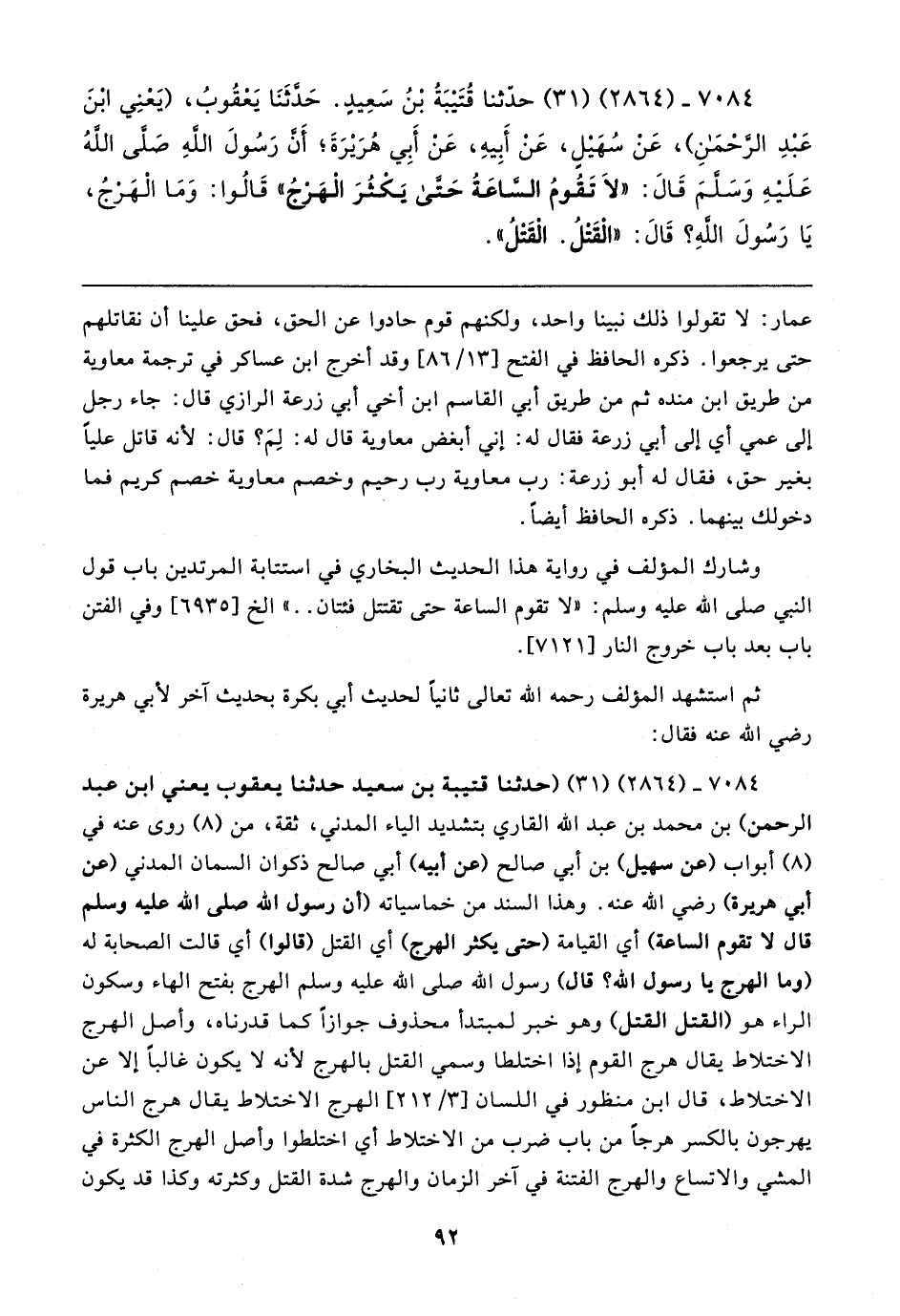 ٧٠٨٤ - (٢٨٦٤) (٣١) حدَّثنا قُتَيبَةُ بْنُ سَعِيدٍ. حَدَّثَنَا يَعْقُوبُ، (يَعْنِي ابنَ عَبْدِ الرَّحْمَنِ)، عَنْ سُهَيلٍ، عَنْ أَبِيهِ، عَنْ أَبِي هُرَيرَةَ؛ أَنَّ رَسُولَ اللهِ صَلَّى اللهُ عَلَيهِ وَسَلَّمَ قَال: "لَا تَقُومُ السَّاعَةُ حَتى يَكثُرَ الْهَرْجُ" قَالُوا: وَمَا الْهَرْجُ، يَا رَسُولَ اللهِ؟ قَال: "الْقَتلُ. الْقَتْلُ"
