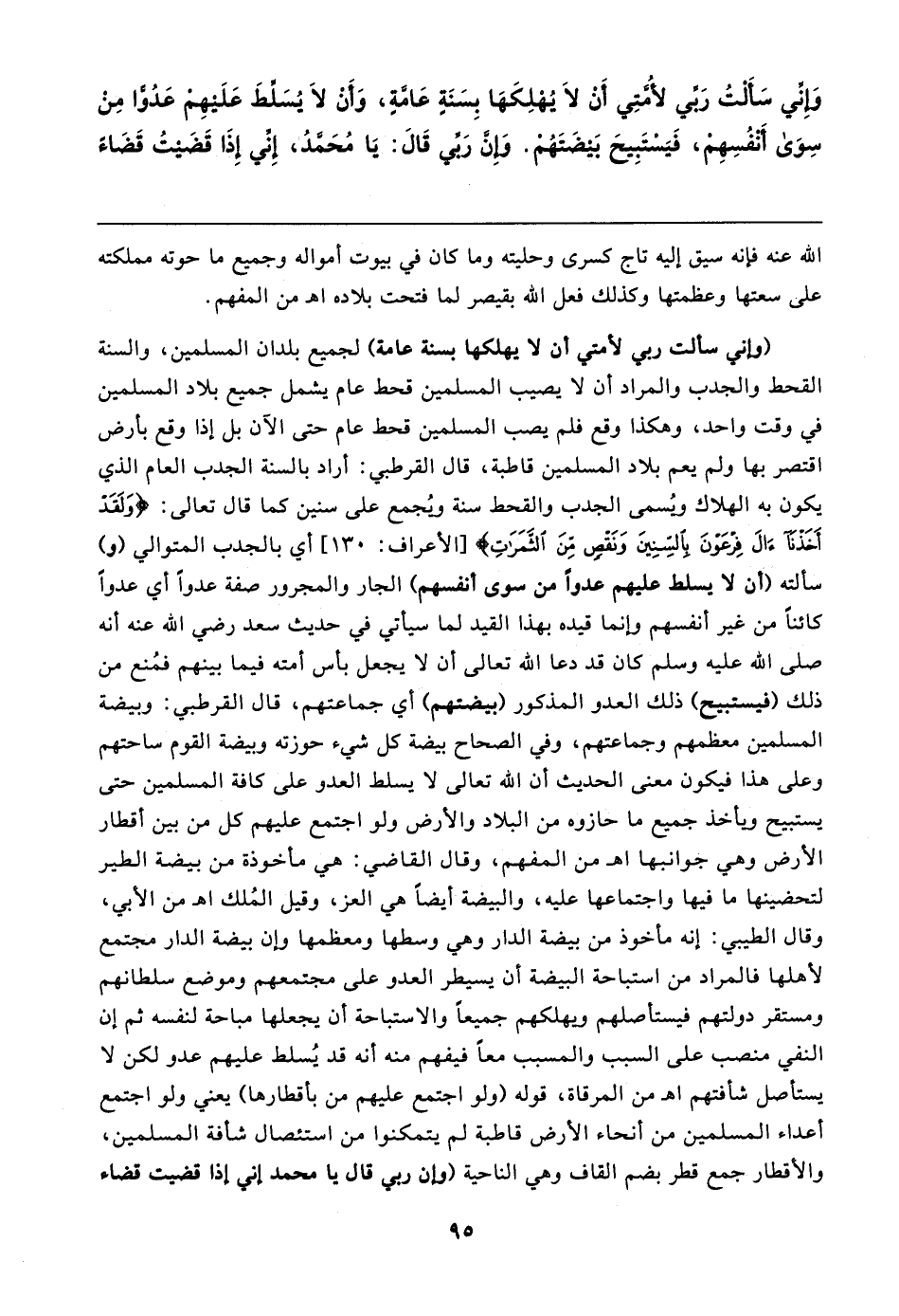 وَإِنِّي سَأَلْتُ رَبِّي لأُمَّتِي أَنْ لَا يُهْلِكَهَا بِسَنَةٍ عَامَّةٍ، وَأَنْ لَا يُسَلِّطَ عَلَيهِمْ عَدُوًّا مِنْ سِوَى نفُسِهِمْ، فَيَسْتَبِيحَ بَيضَتَهُمْ. وَإِنَّ رَبِّي قَال: يَا مُحَمَّدُ، إِنِّي إِذَا قَضَيتُ قَضَاء