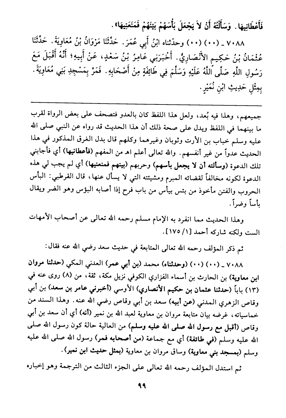 ٧٠٨٨ - (٠٠) (٠٠) (وحدثناه) محمد (بن أبي عمر) العدني المكي (حدثنا مروان بن معاوية) بن الحارث بن أسماء الفزاري الكوفي نزيل مكة، ثقة، من (٨) روى عنه في (١٣) بابا (حدثنا عثمان بن حكيم الأنصاري) الأوسي (أخبرني عامر بن سعد) بن أبي وقاص الزهري المدني (عن أبيه) سعد بن أبي وقاص رضي الله عنه. وهذا السند من خماسياته، غرضه بيان متابعة مروان بن معاوية لعبد الله بن نمير (أنه) أي أن سعد بن أبي وقاص (أقبل مع رسول الله صلى الله عليه وسلم) من العالية حالة كون رسول الله صلى الله عليه وسلم (في طائفة) أي مع جماعة (من أصحابه فمر) رسول الله صلى الله عليه وسلم (بمسجد بني معاوية) وساق مروان بن معاوية (بمثل حديث ابن نمير).