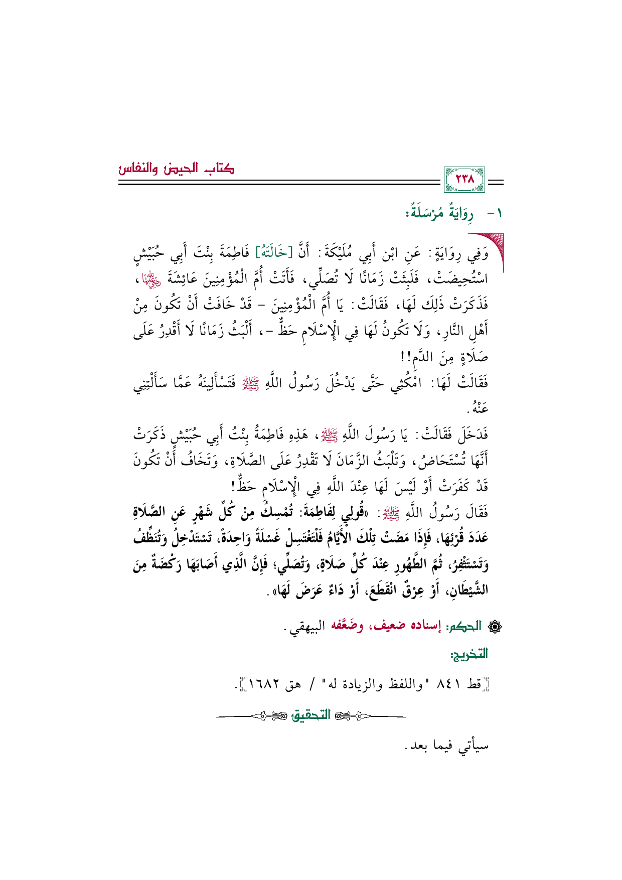 • وَفِي رِوَايَةٍ: عَنِ ابْن أَبِي مُلَيْكَةَ: أَنَّ [خَالَتَهُ] فَاطِمَةَ بِنْتَ أَبِي حُبَيْشٍ اسْتُحِيضَتْ، فَلَبِثَتْ زَمَانًا لَا تُصَلِّي، فَأَتَتْ أُمَّ الْمُؤْمِنِينَ عَائِشَةَ رَضِيَ اللَّهُ عَنْهَا، فَذَكَرَتْ ذَلِكَ لَهَا، فَقَالَتْ: يَا أُمَّ الْمُؤْمِنِينَ - قَدْ خَافَتْ أَنْ تَكُونَ مِنْ أَهْلِ النَّارِ، وَلَا تَكُونُ لَهَا فِي الْإِسْلَامِ حَظٌّ -، أَلْبَثُ زَمَانًا لَا أَقْدِرُ عَلَى صَلَاةٍ مِنَ الدَّمِ!!