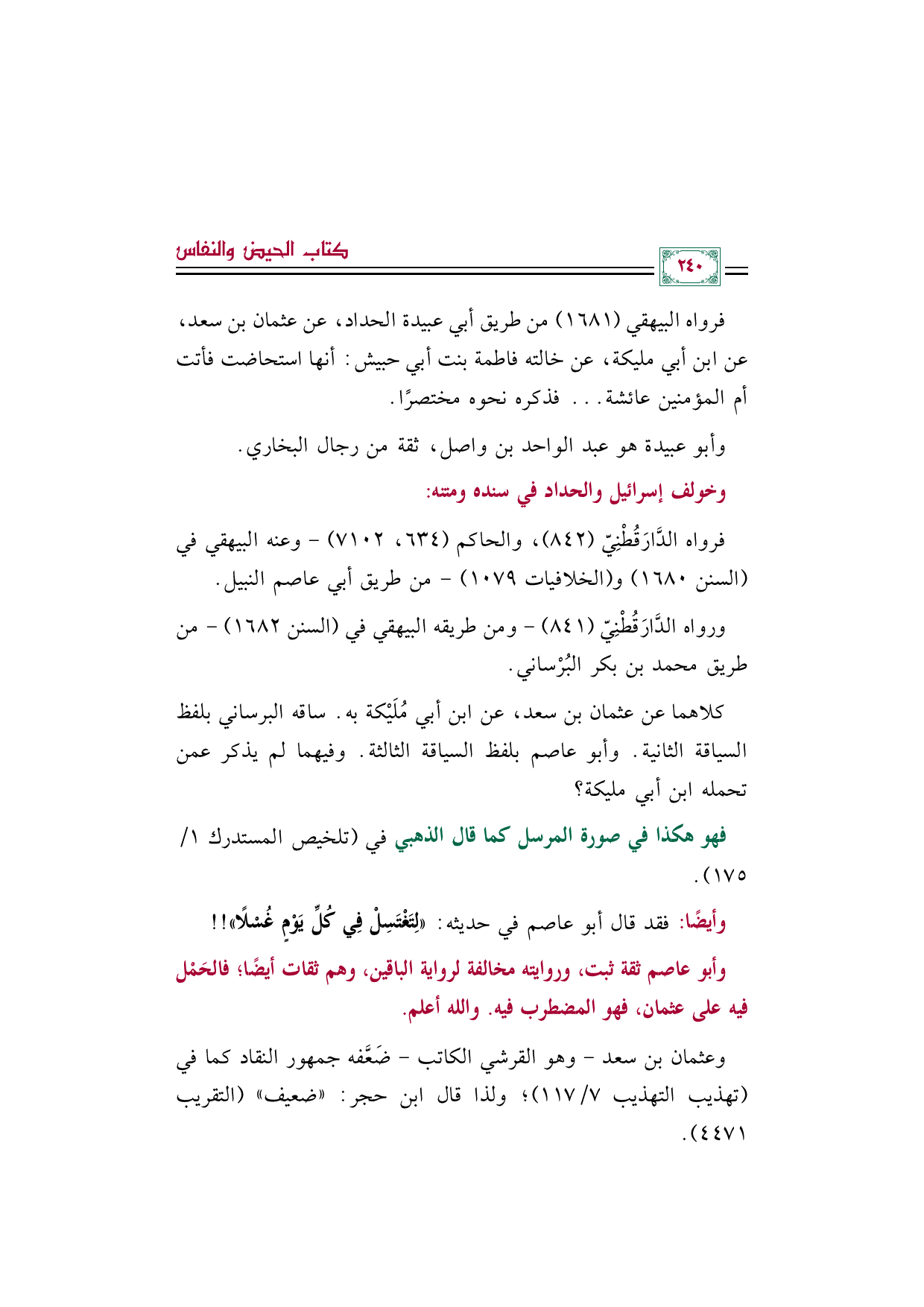 فرواه البيهقي (١٦٨١) من طريق أبي عبيدة الحداد، عن عثمان بن سعد، عن ابن أبي مليكة، عن خالته فاطمة بنت أبي حبيش: أنها استحاضت فأتت أم المؤمنين عائشة ... فذكره نحوه مختصرًا.
