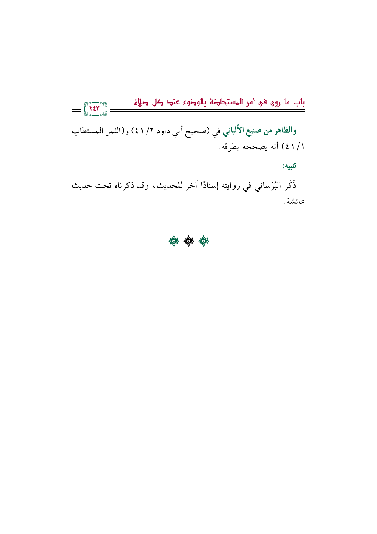 والظاهر من صنيع الألباني في (صحيح أبي داود ٢/ ٤١) و (الثمر المستطاب ١/ ٤١) أنه يصححه بطرقه.