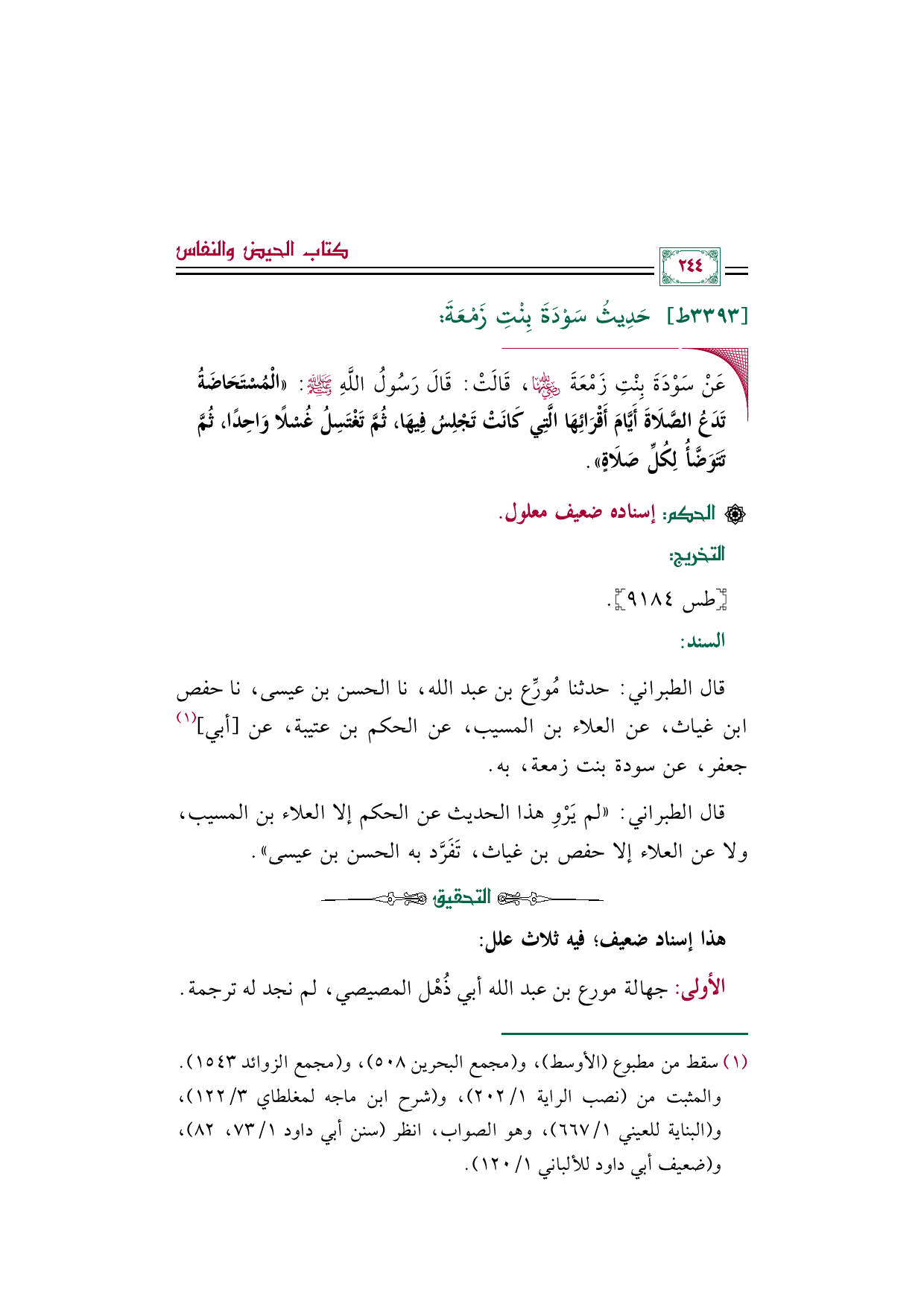 قال الطبراني: حدثنا مُورِّع بن عبد الله، نا الحسن بن عيسى، نا حفص بن غياث، عن العلاء بن المسيب، عن الحكم بن عتيبة، عن [أبي] (¬١) جعفر، عن سودة بنت زمعة، به.