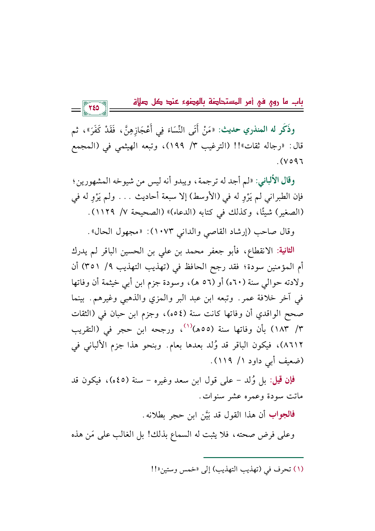 الثانية: الانقطاع، فأبو جعفر محمد بن علي بن الحسين الباقر لم يدرك أم المؤمنين سودة؛ فقد رجح الحافظ في (تهذيب التهذيب ٩/ ٣٥١) أن ولادته حوالي سنة (٦٠ هـ) أو (٥٦ هـ)، وسودة جزم ابن أبي خيثمة أن وفاتها في آخر خلافة عمر. وتبعه ابن عبد البر والمزي والذهبي وغيرهم. بينما صحح الواقدي أن وفاتها كانت سنة (٥٤ هـ)، وجزم ابن حبان في (الثقات ٣/ ١٨٣) بأن وفاتها سنة (٥٥ هـ) (¬١)، ورجحه ابن حجر في (التقريب ٨٦١٢)، فيكون الباقر قد وُلد بعدها بعام. وبنحو هذا جزم الألباني في (ضعيف أبي داود ١/ ١١٩).