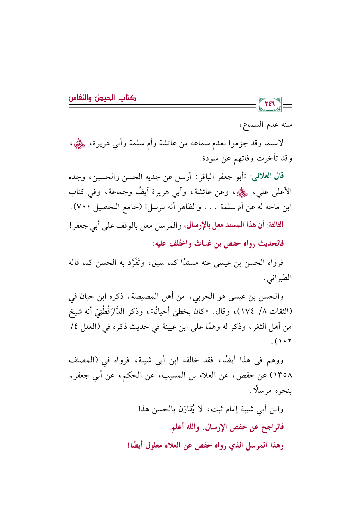 وهذا المرسل الذي رواه حفص عن العلاء معلول أيضًا!