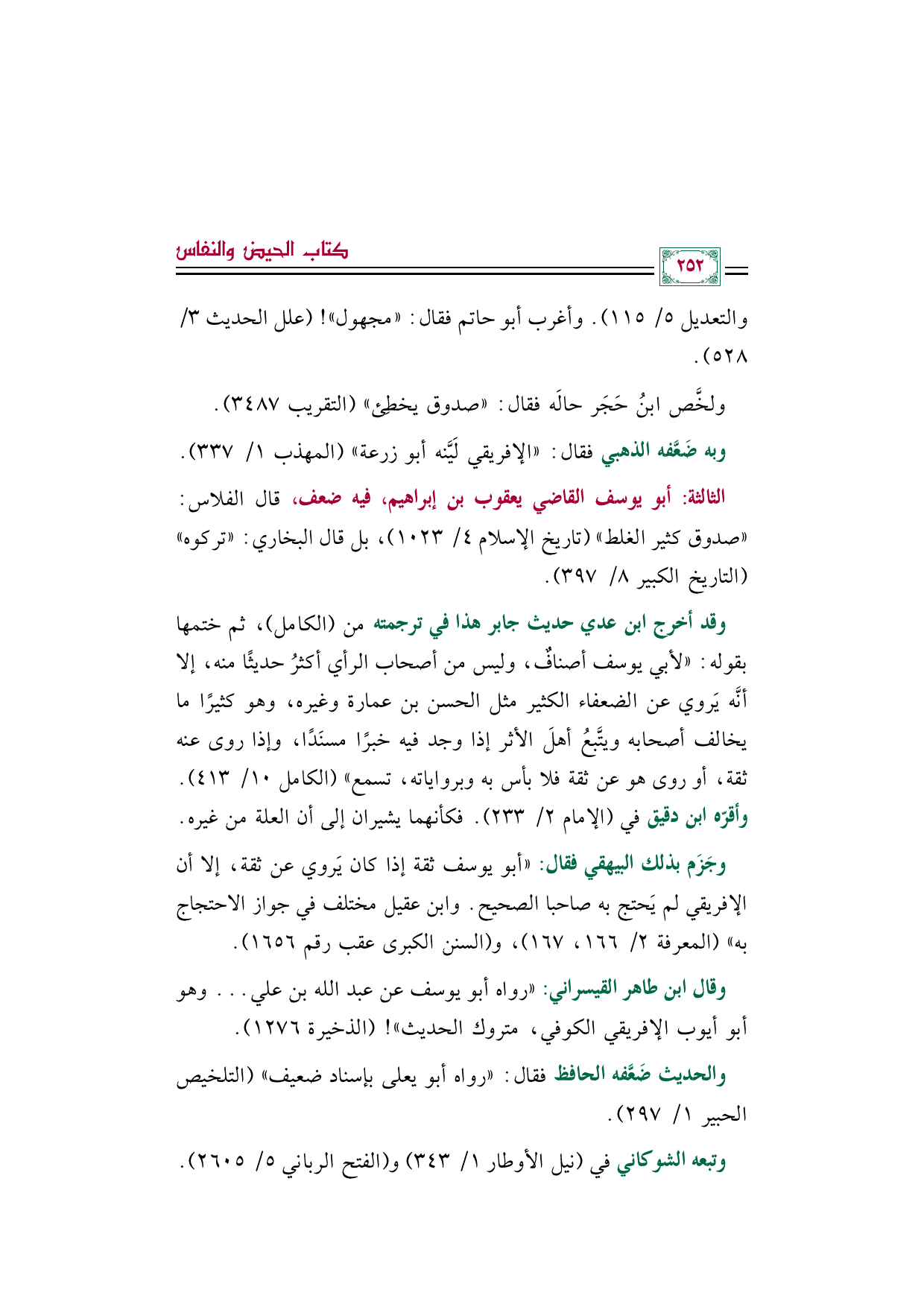 وقد أخرج ابن عدي حديث جابر هذا في ترجمته من (الكامل)، ثم ختمها بقوله: ((لأبي يوسف أصنافٌ، وليس من أصحاب الرأي أكثرُ حديثًا منه، إلا أنَّه يَروي عن الضعفاء الكثير مثل الحسن بن عمارة وغيره، وهو كثيرًا ما يخالف أصحابه ويتَّبعُ أهلَ الأثر إذا وجد فيه خبرًا مسنَدًا، وإذا روى عنه ثقة، أو روى هو عن ثقة فلا بأس به وبرواياته، تسمع)) (الكامل ١٠/ ٤١٣). وأقرّه ابن دقيق في (الإمام ٢/ ٢٣٣). فكأنهما يشيران إلى أن العلة من غيره.