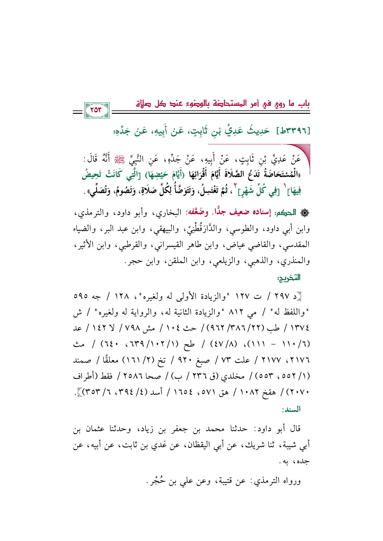 قال أبو داود: حدثنا محمد بن جعفر بن زياد، وحدثنا عثمان بن أبي شيبة، ثنا شريك، عن أبي اليقظان، عن عَدي بن ثابت، عن أبيه، عن جده، به.