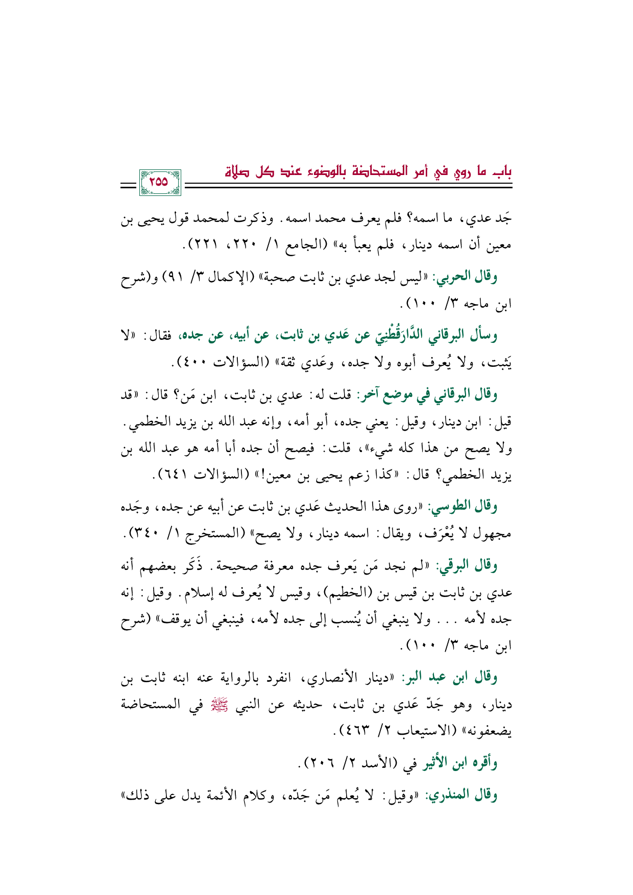وقال الحربي: ((ليس لجد عدي بن ثابت صحبة)) (الإكمال ٣/ ٩١) و (شرح ابن ماجه ٣/ ١٠٠).