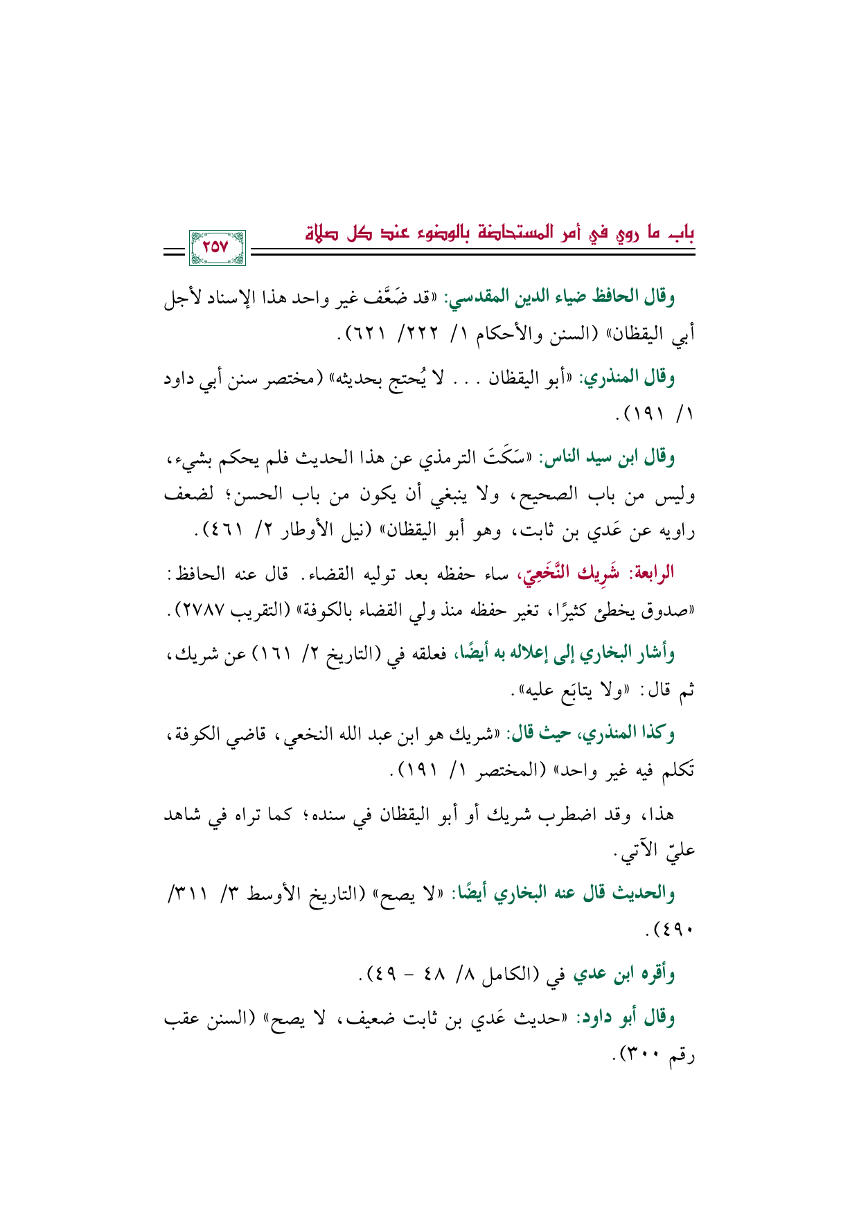 وقال أبو داود: ((حديث عَدي بن ثابت ضعيف، لا يصح)) (السنن عقب رقم ٣٠٠).