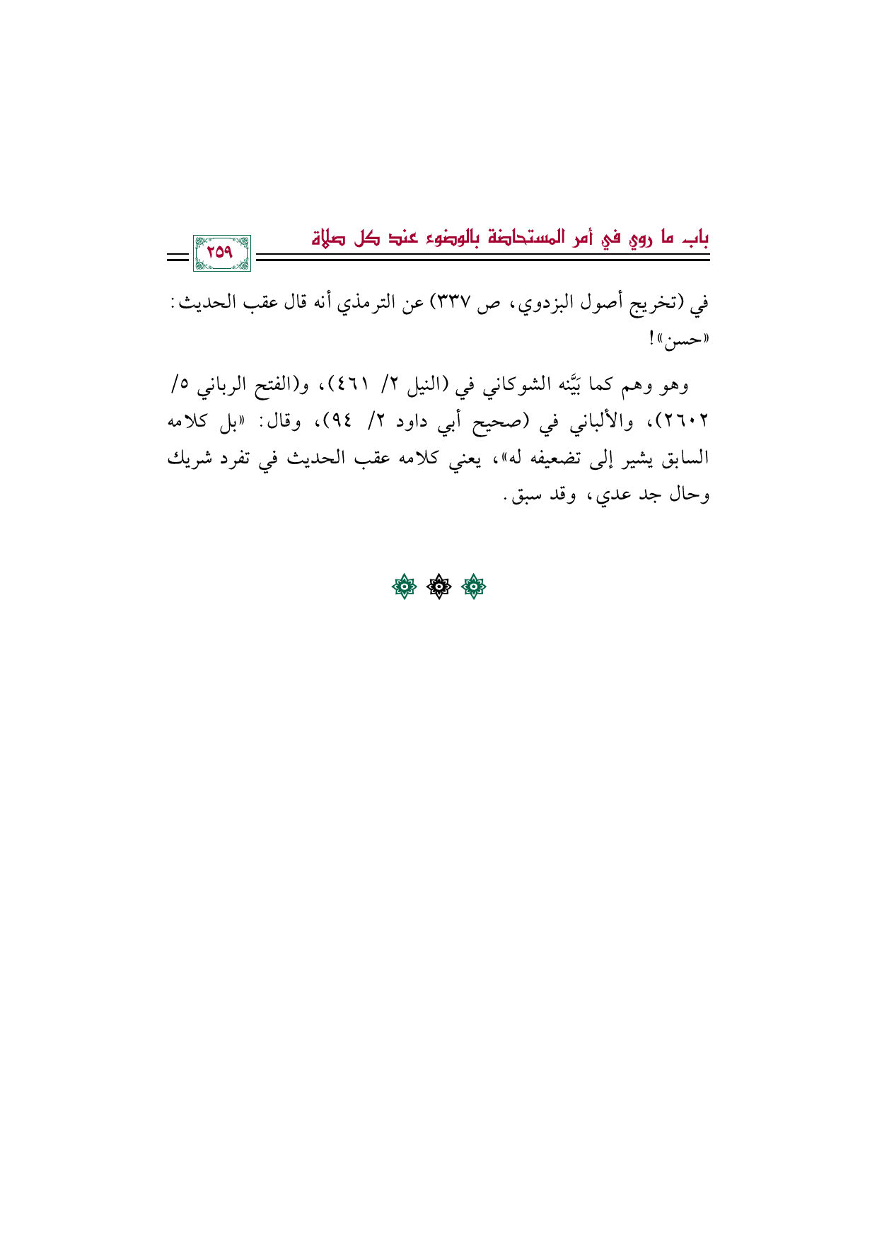 وهو وهم كما بَيَّنه الشوكاني في (النيل ٢/ ٤٦١)، و (الفتح الرباني ٥/ ٢٦٠٢)، والألباني في (صحيح أبي داود ٢/ ٩٤)، وقال: ((بل كلامه السابق يشير إلى تضعيفه له))، يعني كلامه عقب الحديث في تفرد شريك وحال جد عدي، وقد سبق.