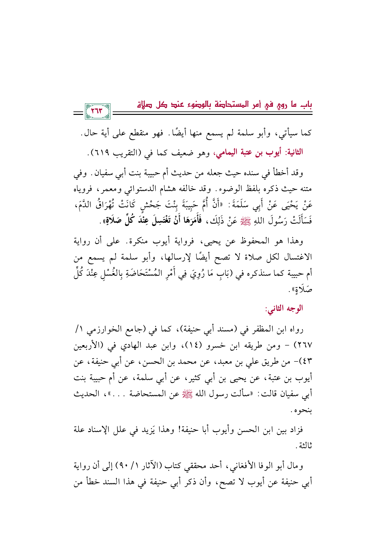 وهذا هو المحفوظ عن يحيى، فرواية أيوب منكرة. على أن رواية الاغتسال لكل صلاة لا تصح أيضًا لإرسالها، وأبو سلمة لم يسمع من أم حبيبة كما سنذكره في (بَابِ مَا رُوِيَ فِي أَمْرِ المُسْتَحَاضَةِ بِالغُسْلِ عِنْدَ كُلِّ صَلَاةٍ).
