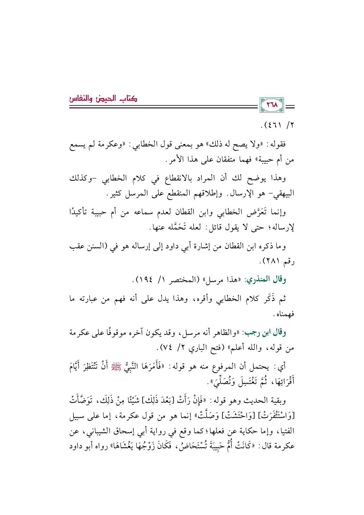 وبقية الحديث وهو قوله: ((فَإِنْ رَأَتْ [بَعْدَ ذَلِكَ] شَيْئًا مِنْ ذَلِكَ، تَوَضَّأَتْ [وَاسْتَثْفَرَتْ] [وَاحْتَشَتْ] وَصَلَّتْ)) إنما هو من قول عكرمة، إما على سبيل الفتيا، وإما حكاية عن فعلها؛ كما وقع في رواية أبي إسحاق الشيباني، عن عكرمة قال: ((كَانَتْ أُمُّ حَبِيبَةَ تُسْتَحَاضُ، فَكَانَ زَوْجُهَا يَغْشَاهَا)) رواه أبو داود