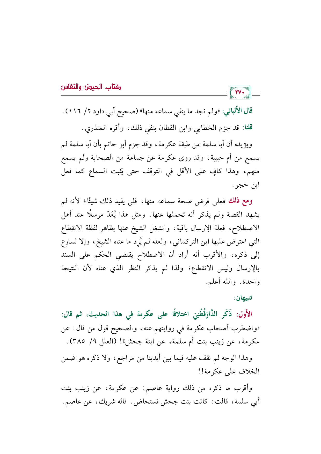ويؤيده أن أبا سلمة من طبقة عكرمة، وقد جزم أبو حاتم بأن أبا سلمة لم يسمع من أم حبيبة، وقد روى عكرمة عن جماعة من الصحابة ولم يسمع منهم، وهذا كافٍ على الأقل في التوقف حتى يَثبت السماع كما فعل ابن حجر.